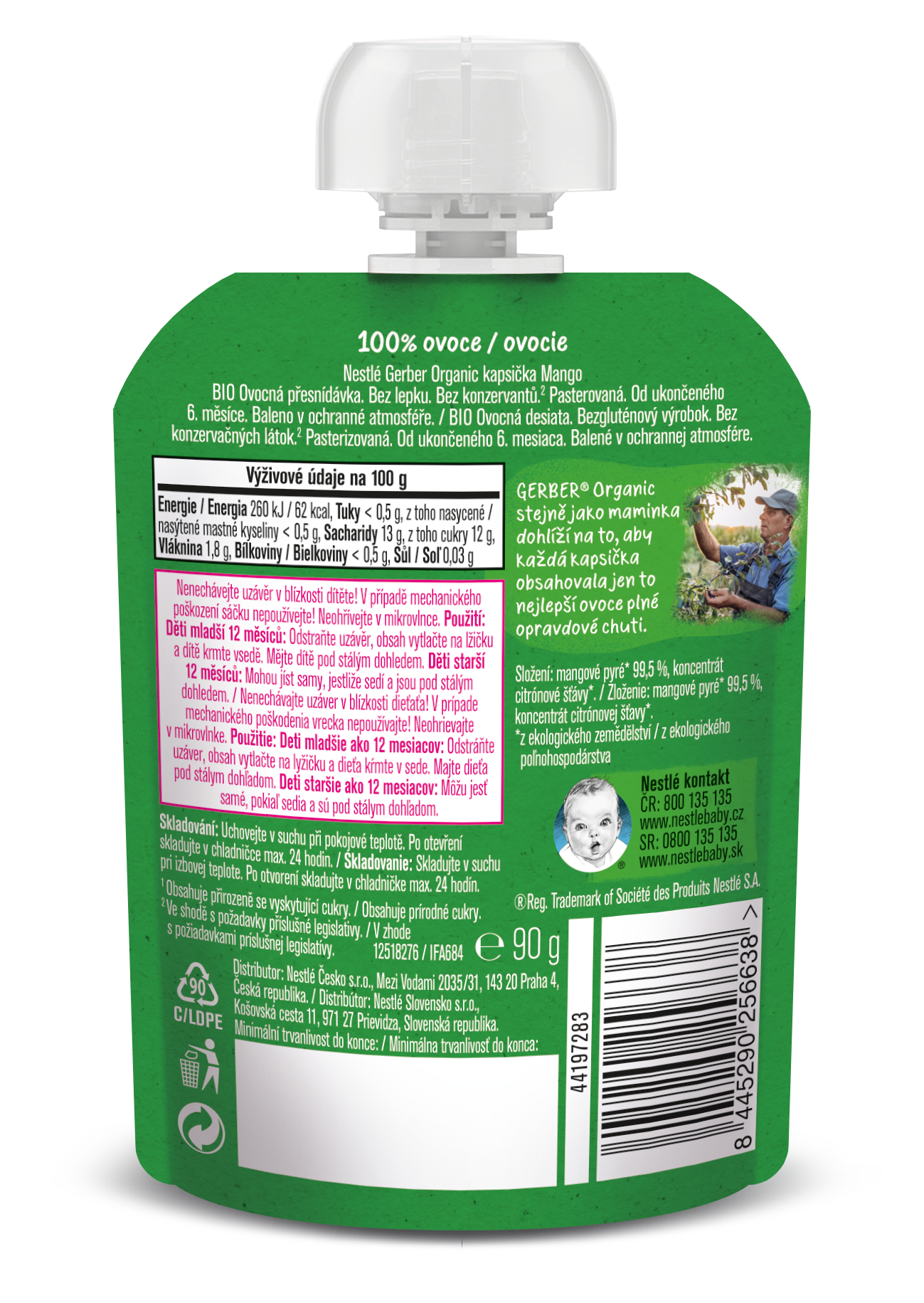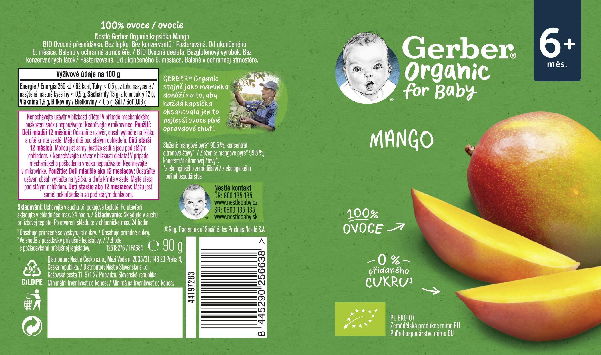 GERBER Organic kapsička mango je vyrobená z nejkvalitnějšího ovoce. Kapsička obsahuje pyré ze zralých kousků manga a kapku citronové šťávy. Váš malý jedlík má tak vynikající chuť ovoce na dosah ručičky. GERBER Organic stejně jako maminka dohlíží na to, aby každá kapsička obsahovala jen to nejlepší ovoce plné opravdové chuti. S GERBER Organic kapsičkami máte vždy po ruce chutnou svačinku plnou ovoce bez přidaných cukrů*, bez lepku, bez konzervantů** díky níž si váš malý jedlík užije přirozenou chuť ovoce. Abychom zajistili prvotřídní kvalitu pro vaše nejmenší, spolupracujeme s farmáři z certifikovaných BIO farem, kde je brán ohled na přirozený způsob pěstování a dozrávání všech plodin. 100 % ovoce z ekologického zemědělství 0 % přidaného cukru* Ovoce od BIO certifikovaných farmářů, kteří respektují přirozený řád přírody BEZ lepku BEZ konzervantů**