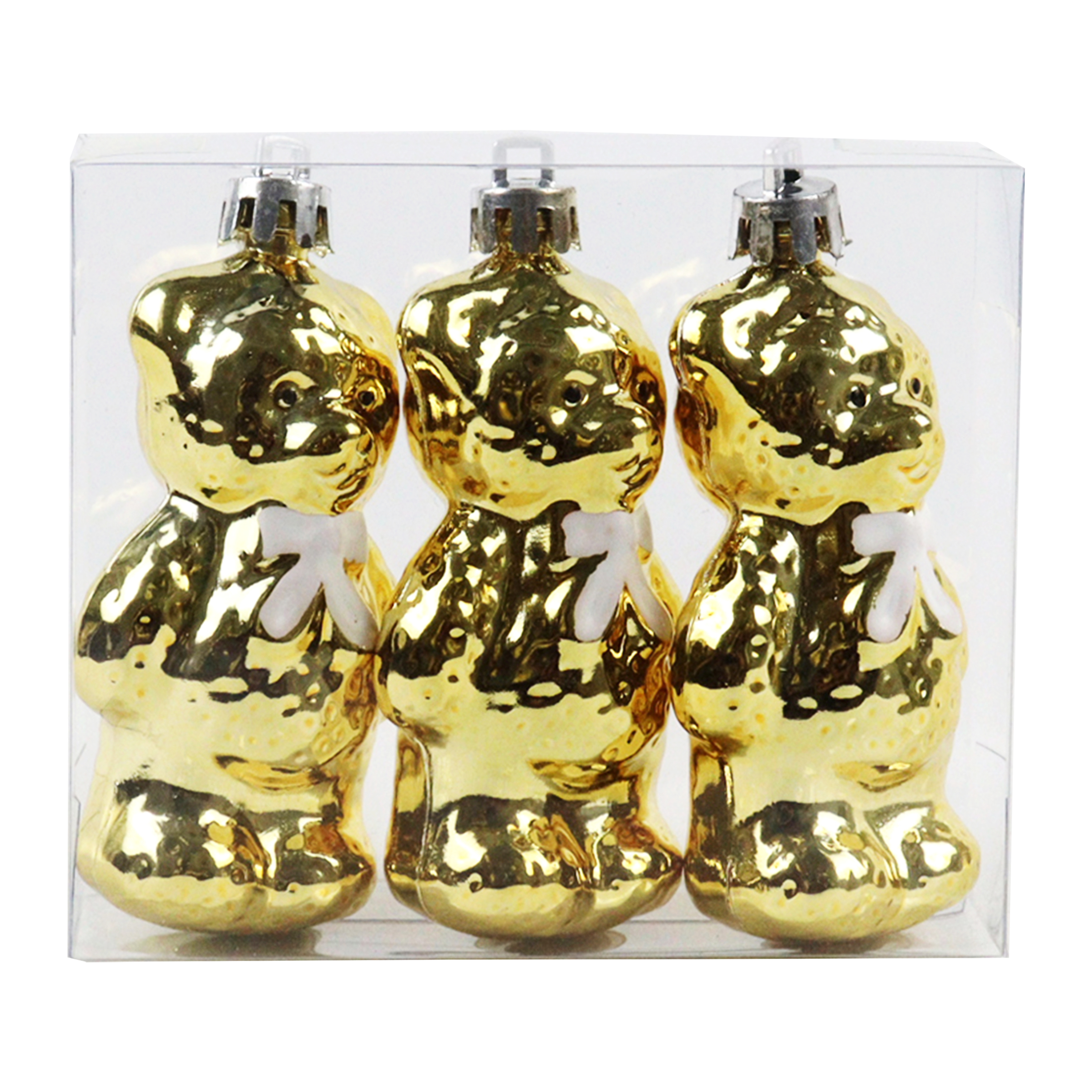 Roztomilé zlaté ozdoby ve tvaru medvídků s bílou mašlí kolem krku dodají vašemu stromečku hravý a elegantní vzhled. Balení obsahuje 3 kusy – ideální pro doladění vánoční atmosféry s jemným nádechem nostalgie. Výška: 9 cm