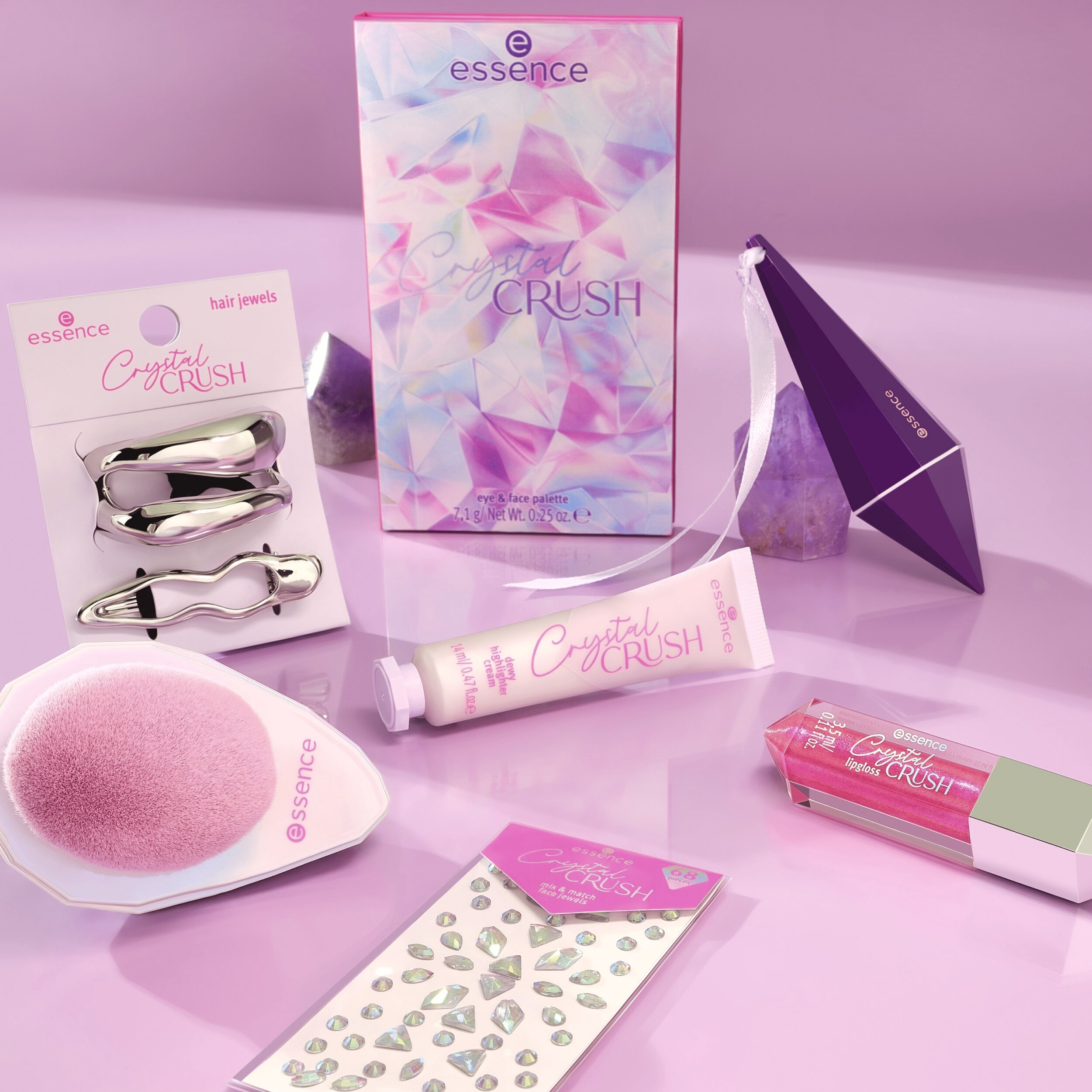 Rozjasněte své líčení silou krystalů a objevte essence Crystal Crush paletku na oči a tvář 01 Quartz Crush. Tato paletka inspirovaná relaxační energií a barvou růženínu a ametystu, obsahuje šest očních stínů v jemných matných a krémových třpytivých odstínech, které dodají každému líčení hloubku, záři a třpyt inspirovaný krystaly. To nejlepší: mramorovaná, pH-reaktivní gelová tvářenka, která se přizpůsobí vaší pokožce a dodá vašim tvářím jemný růžový nádech se zářivým rozjasněním. Sada očních stínů připomíná fialový třpyt ametystové drůzy a obsahuje lentikulární obraz pro extra křišťálovou atmosféru, což z ní dělá opravdový kosmetický poklad.