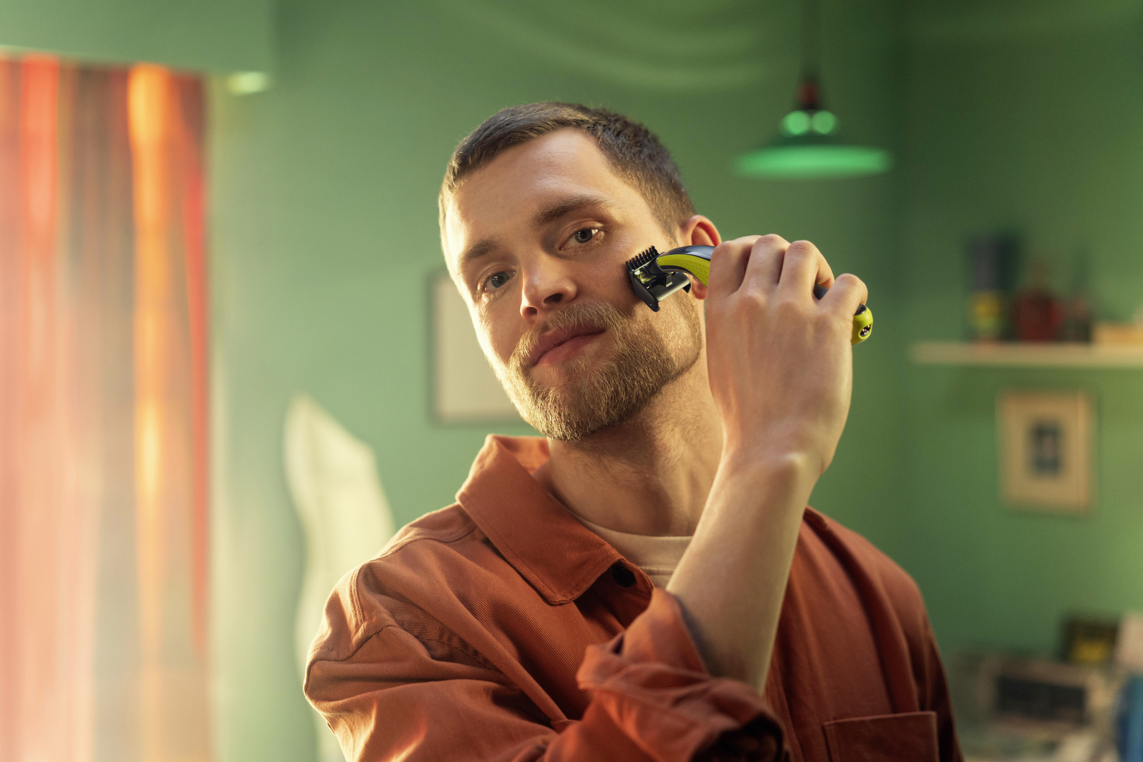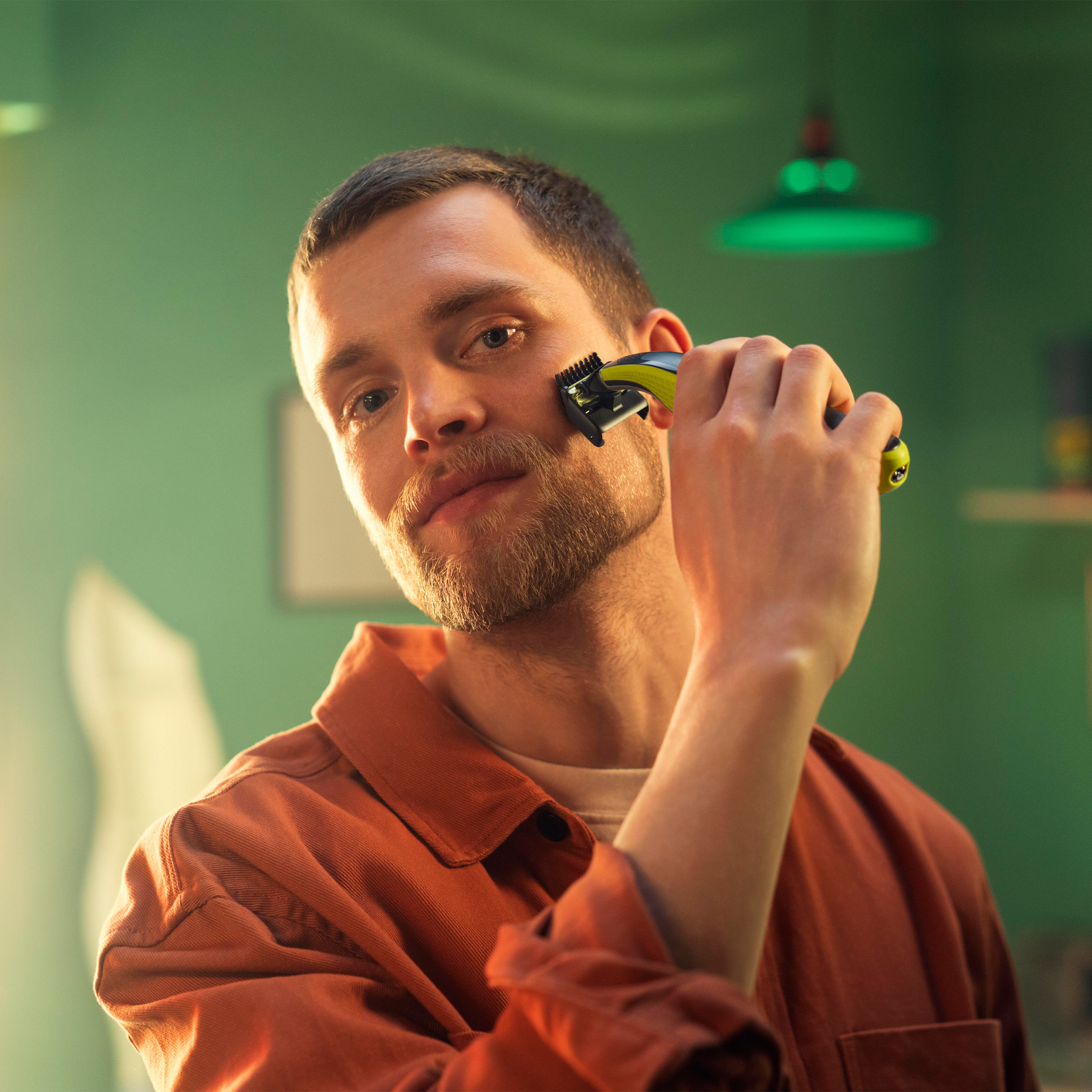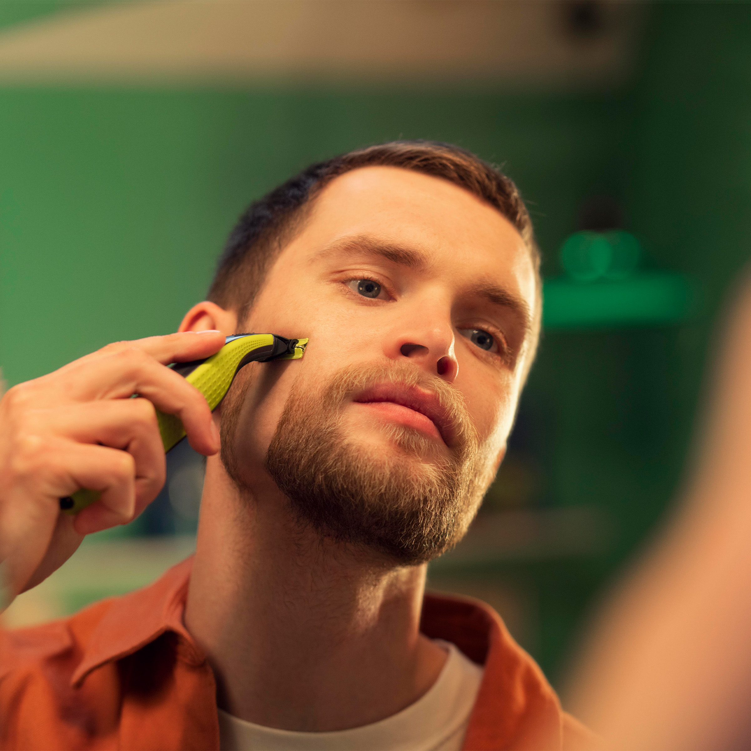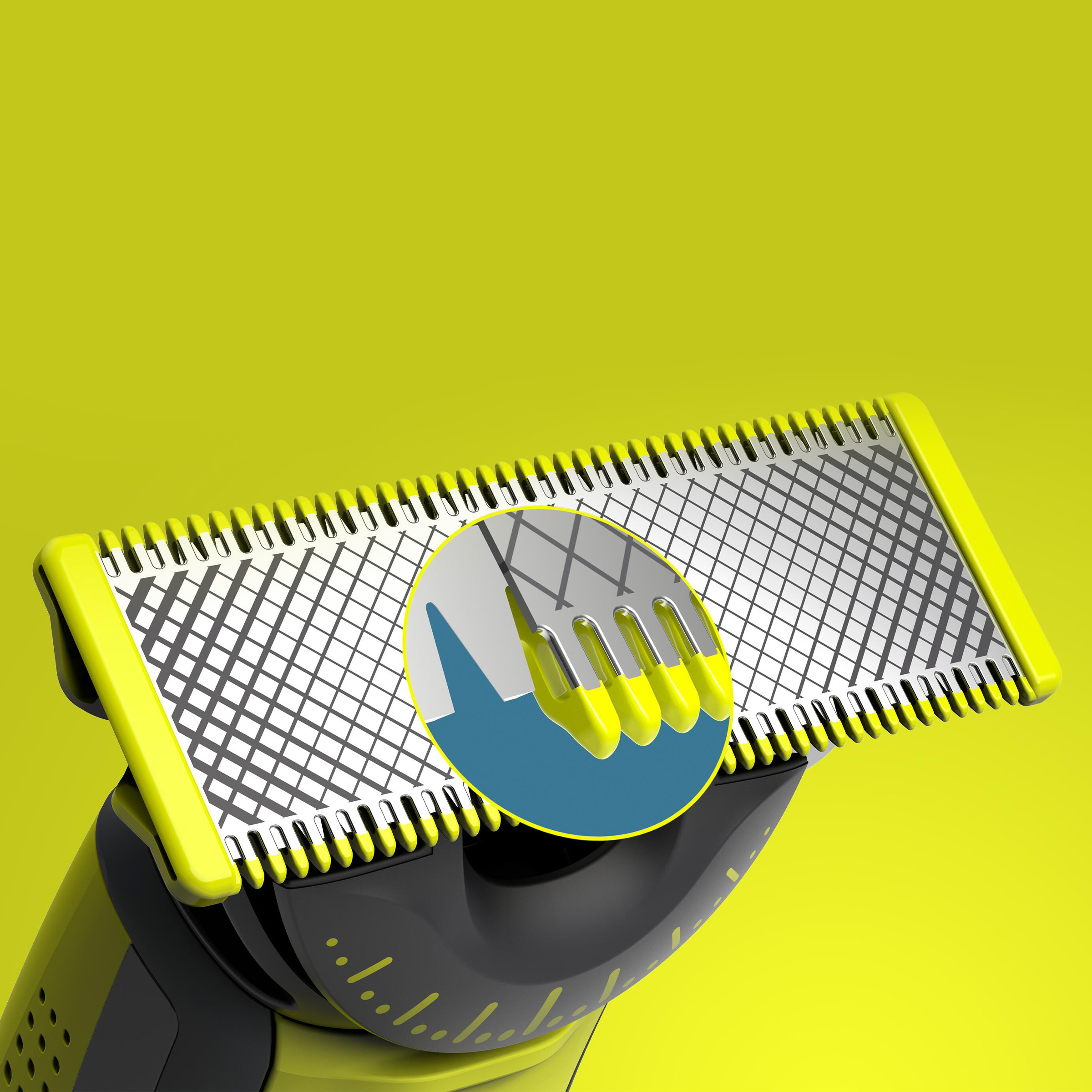 - OneBlade kopíruje obrysy vaší tváře a umožňuje jednoduše a pohodlně zastřihovat a holit všechny části obličeje. Dodejte dvoustranným břitem svému vzhledu styl a pohybem břitu v kterémkoli směru vytvořte čisté linie.