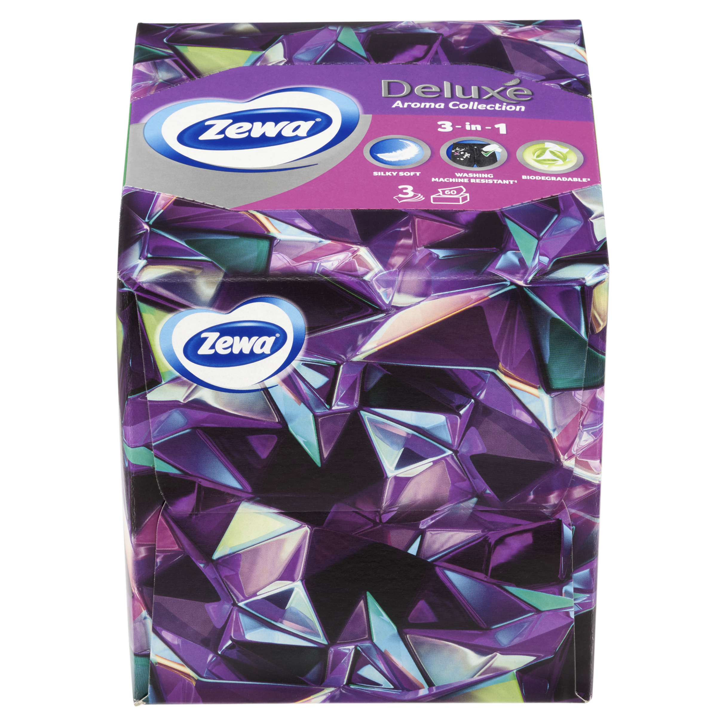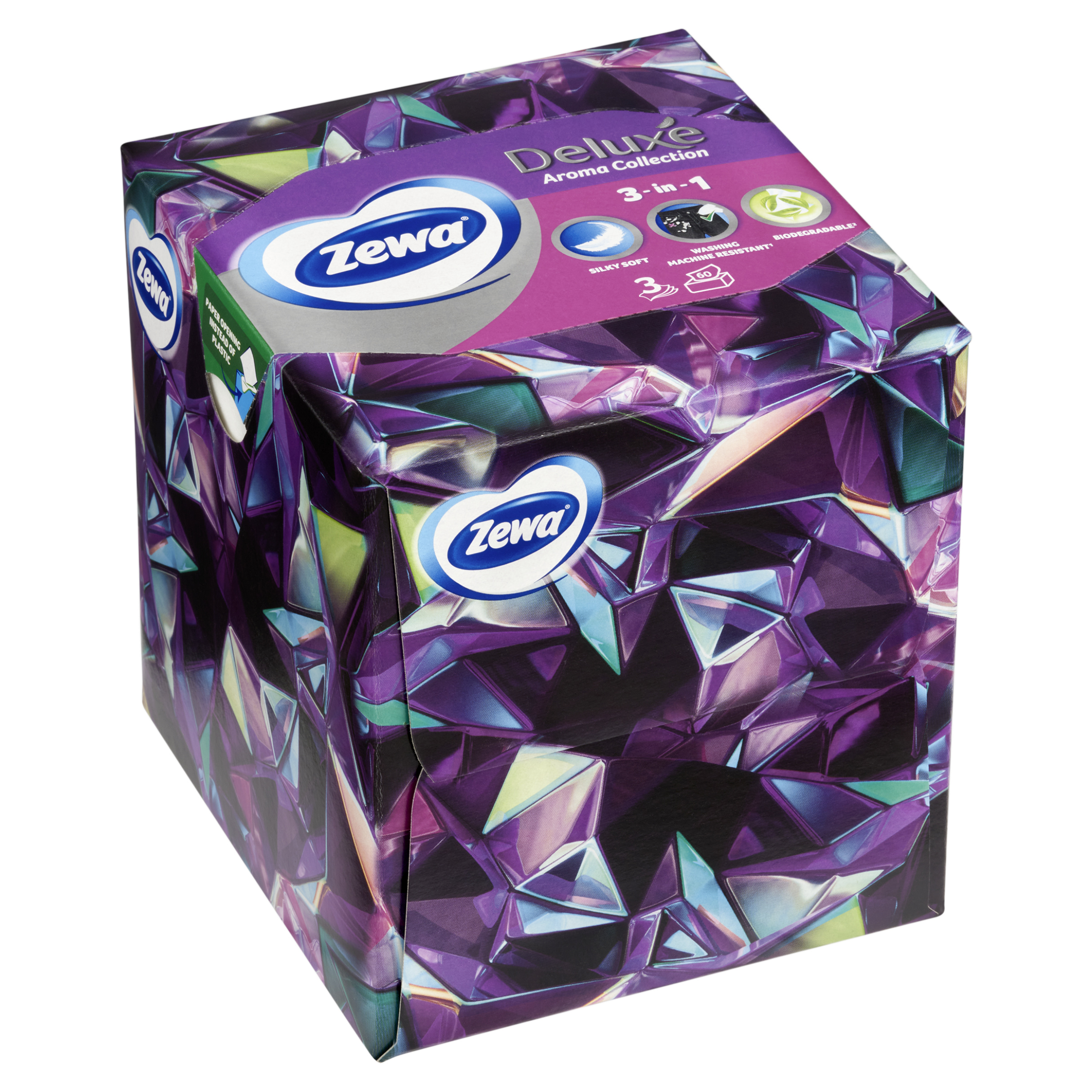 Třívrstvé kapesníčky prvotřídní kvality s jemnou parfemací, které jsou odolné vůči praní. Krabičku ve tvaru kostky s atraktivním designem lze prakticky umístit kdekoli v domácnosti. Dermatologicky testováno. Vyrobeny v Německu ze 100% celulózy. Pokud kapesníky Zewa omylem vyperete v pračce tak se nemusíte bát, nerozpadnou se, jsou totiž odolné vůči praní, avšak i přesto si zachovávají svou jemnost. Navíc se krabičky nabízí v různých variantách designu, takže si můžete vybrat ten který se vám do interiéru hodí nejvíce. Obal produktu je recyklovatelný a vyroben z 70% recyklovaného papíru, navíc otevírání krabiček je již z papíru místo plastu, takže se mnohem snáze recyklují. Tyto kapesníčky se mohou chlubit certifikací FSC, to znamená, že výrobek pochází ze šetrně obhospodařovaných lesů. Dermatologicky testováno. Snížení CO₂ a recyklovatelný obal. Snížení uhlíkové stopy u obalů díky vylepšení výrobních procesů dodavatele a snížení uhlíkové stopy, s využitím metody posuzování životního cyklu aplikované společností Essity a ověřené nezávislou třetí stranou. Recyklovatelný obal v souladu s požadavky normy EN 13430. Malé množství nerecyklovatelných zbytků. Více informací na www.zewa.net/cz.