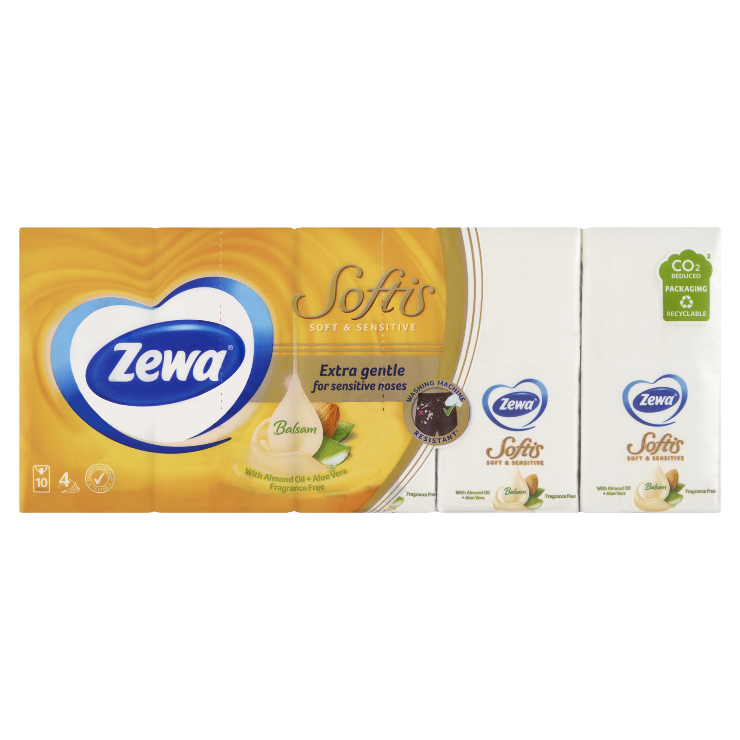 Tyto jemné a šetrné kapesníčky obsahují jedinečnou kombinaci mandlového oleje a Aloe vera, to jim dodává mimořádnou jemnost pro vaši pokožku a zároveň jsou vhodné pro časté používání. Dny zarudlé a podrážděné pokožky kolem vašeho nosu jsou navždy pryč. Čtyřvrstvé kapesníčky zklidňují a ulevují vaší pokožce. Dopřejte svému nosu pocítit ten rozdíl! Pokud kapesníky Zewa omylem vyperete v pračce tak se nemusíte bát, nerozpadnou se, jsou totiž odolné vůči praní, avšak i přesto si zachovávají svou jemnost. Obal produktu je recyklovatelný. Tyto kapesníčky se mohou chlubit certifikací FSC, to znamená, že výrobek pochází ze šetrně obhospodařovaných lesů.