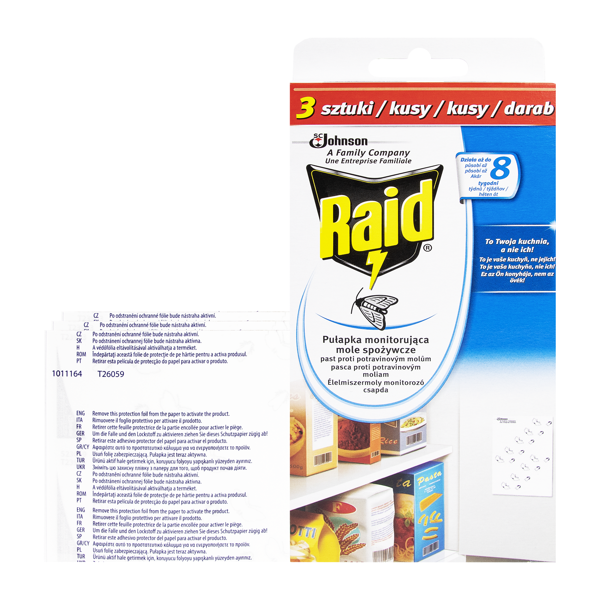 Raid® past proti potravinovým molům obsahuje atraktivní látku, která přivábí samčí moly. Jedinci se přilepí na papírový proužek s lepem a tím se odhalí problém před větším zamořením.