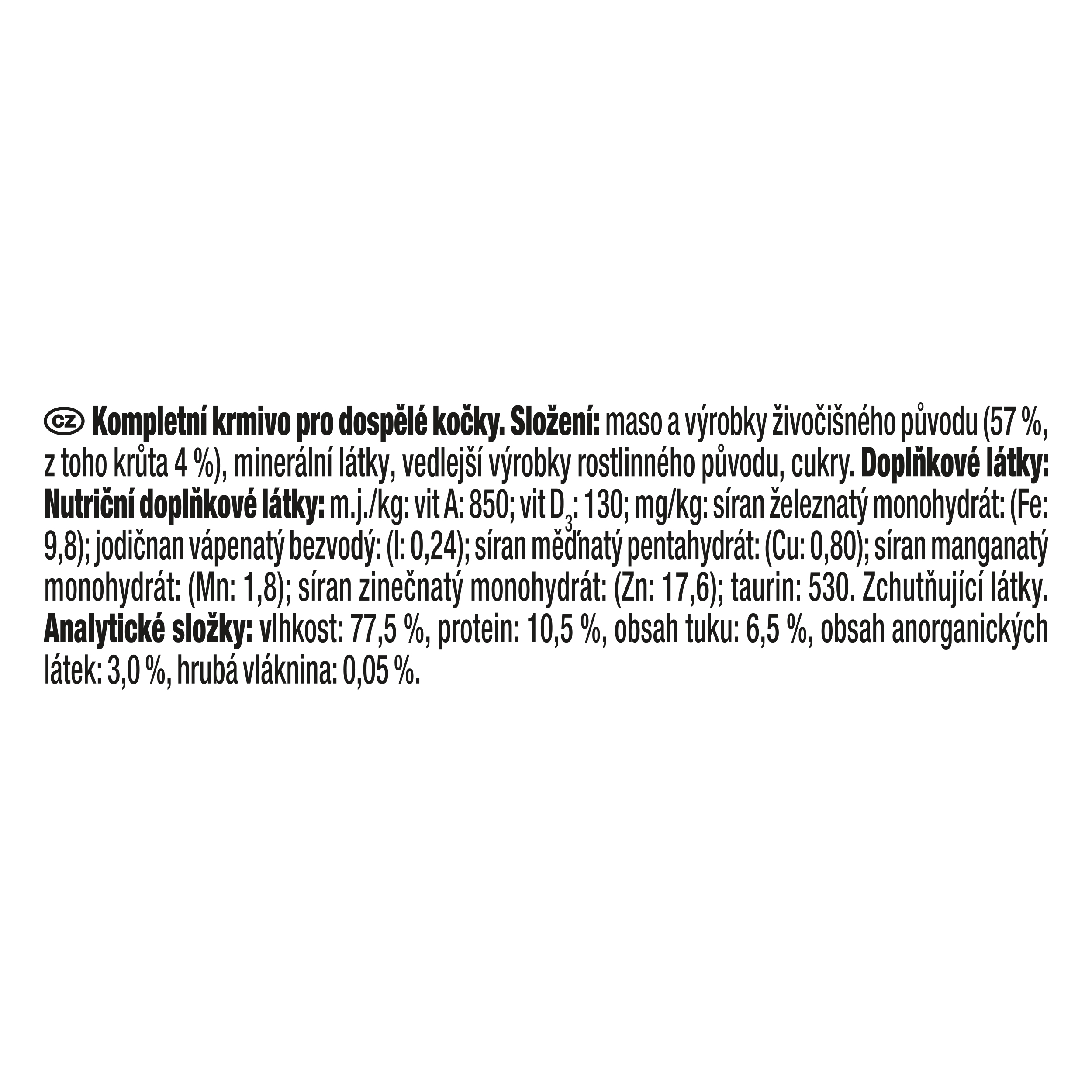 Doplňkové látky: Nutriční doplňkové látky: m.j./kg: vit A: 850; vit D3: 130; mg/kg: síran železnatý monohydrát: (Fe: 9,8); jodičnan vápenatý bezvodý: (I: 0,24); síran měďnatý pentahydrát: (Cu: 0,80); síran manganatý monohydrát: (Mn: 1,8); síran zinečnatý monohydrát: (Zn: 17,6); taurin: 530. Zchutňující látky.
