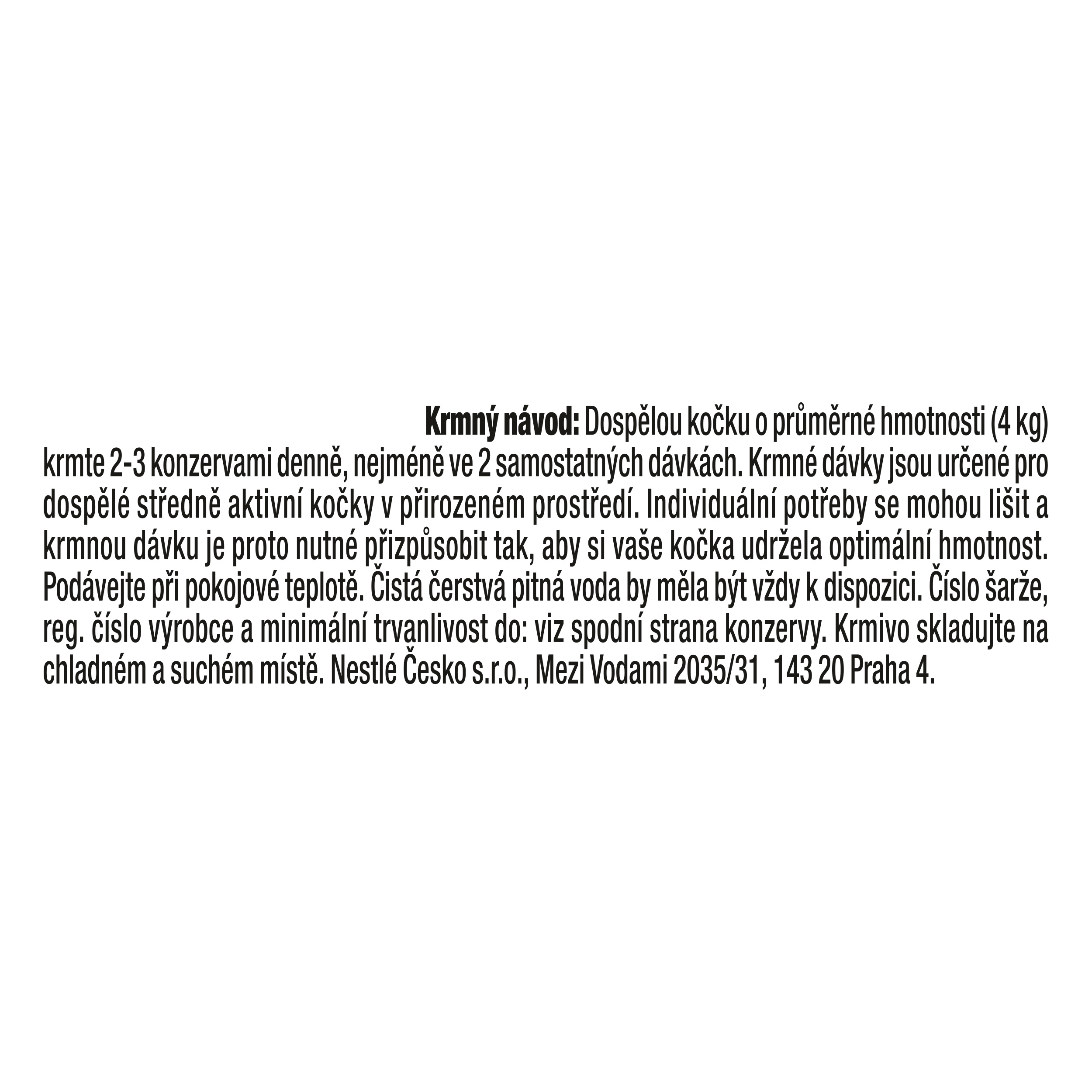 Krmný návod: Dospělou kočku o průměrné hmotnosti (4 kg) krmte 2 - 3 konzervami denně, nejméně ve 2 samostatných dávkách. Krmné dávky jsou určené pro dospělé středně aktivní kočky v přirozeném prostředí. Individuální potřeby se mohou lišit a krmnou dávku je proto nutné přizpůsobit tak, aby si vaše kočka udržela optimální hmotnost. Podávejte při pokojové teplotě. Čistá čerstvá pitná voda by měla být vždy k dispozici.