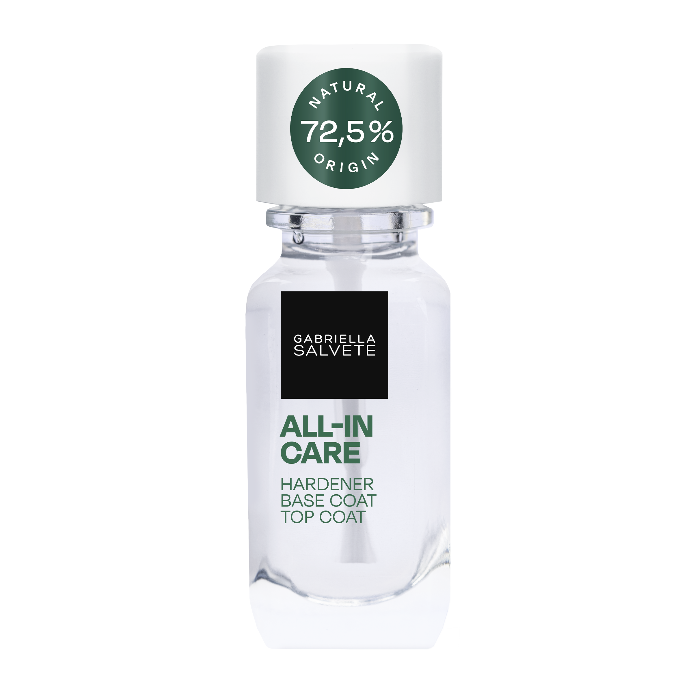 Přírodní péče na nehty All-in Care od Gabrielly Salvete obsahuje vše důležité pro pevnější, silnější a zdravější nehty v jedné lahvičce. All-in Care můžete používat jako intenzivní posilující kúru na nehty nebo jako podkladovou a vrchní vrstvu při své manikúře. Prodlužuje výdrž laku až o 3 dny. Obsahuje 72, 5 % látek přírodního původu.
