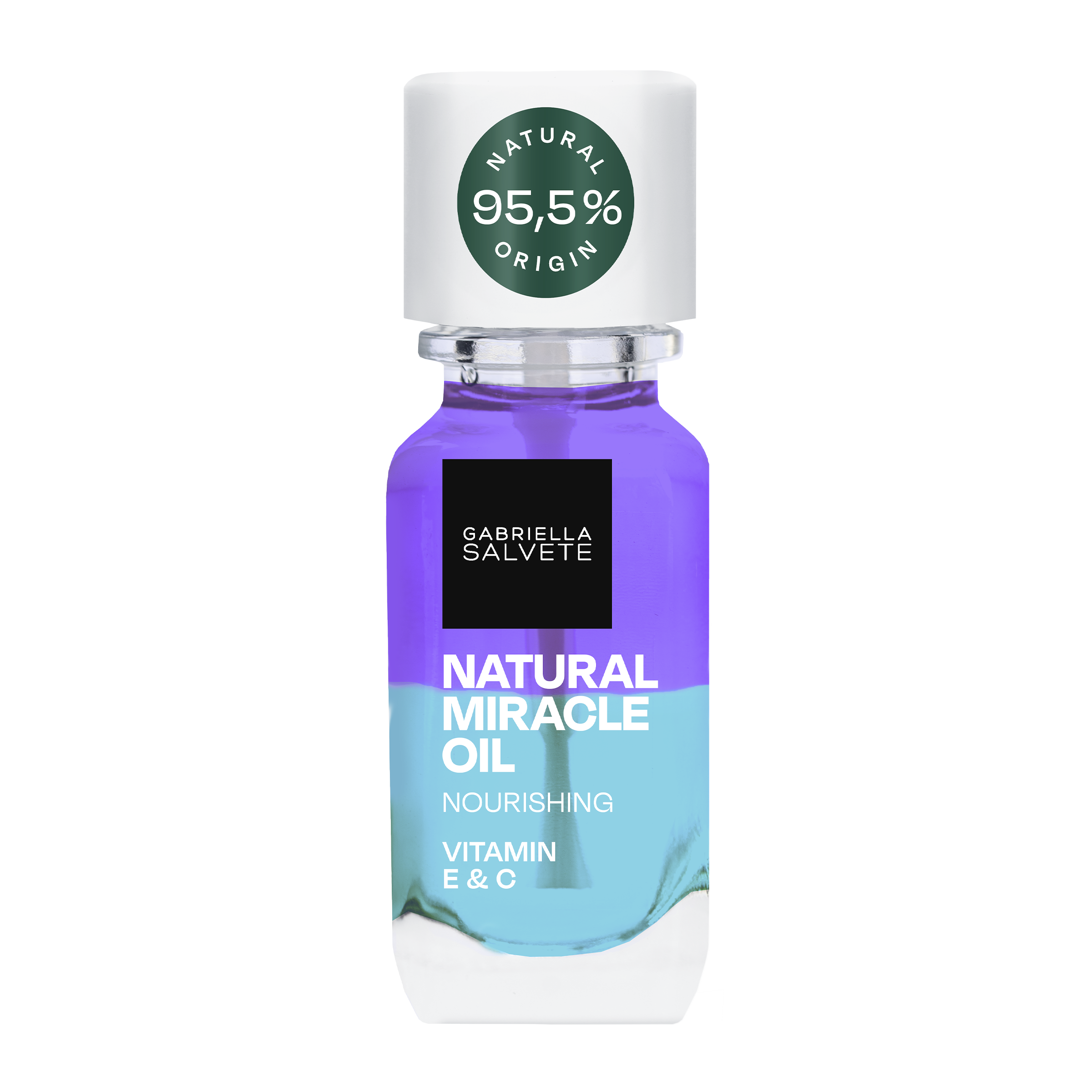Natural Miracle Oil je zázrak na nehty s převážně přírodním složením (95, 5 % složek přírodního původu). Obnovuje zdraví nehtů, okamžitě hydratuje a rychle a do hloubky vyživuje. Obsahuje vitamín E a výtažek z karamboly (hvězdné ovoce), která je bohatá na vitamín C. Před aplikací je potřeba olejíček protřepat.