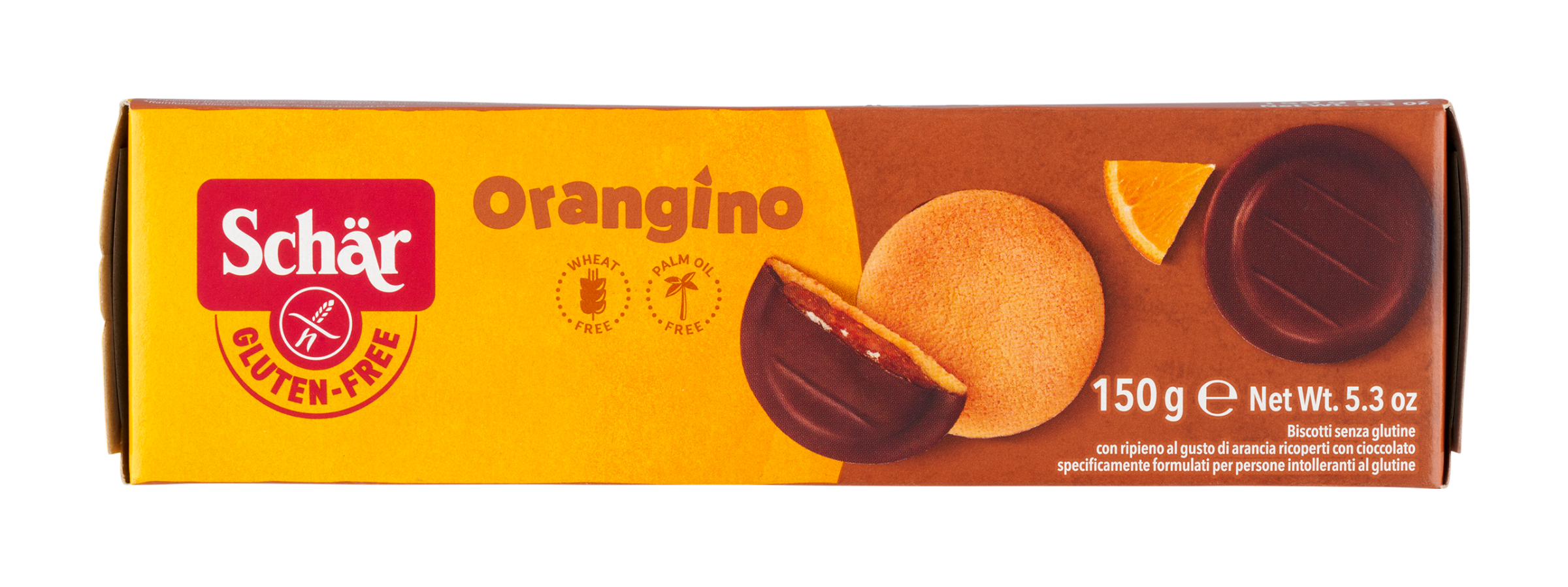 Schär Orangino pečivo bez lepku polomáčené v čokoládě s náplní s příchutí z pomeranče.