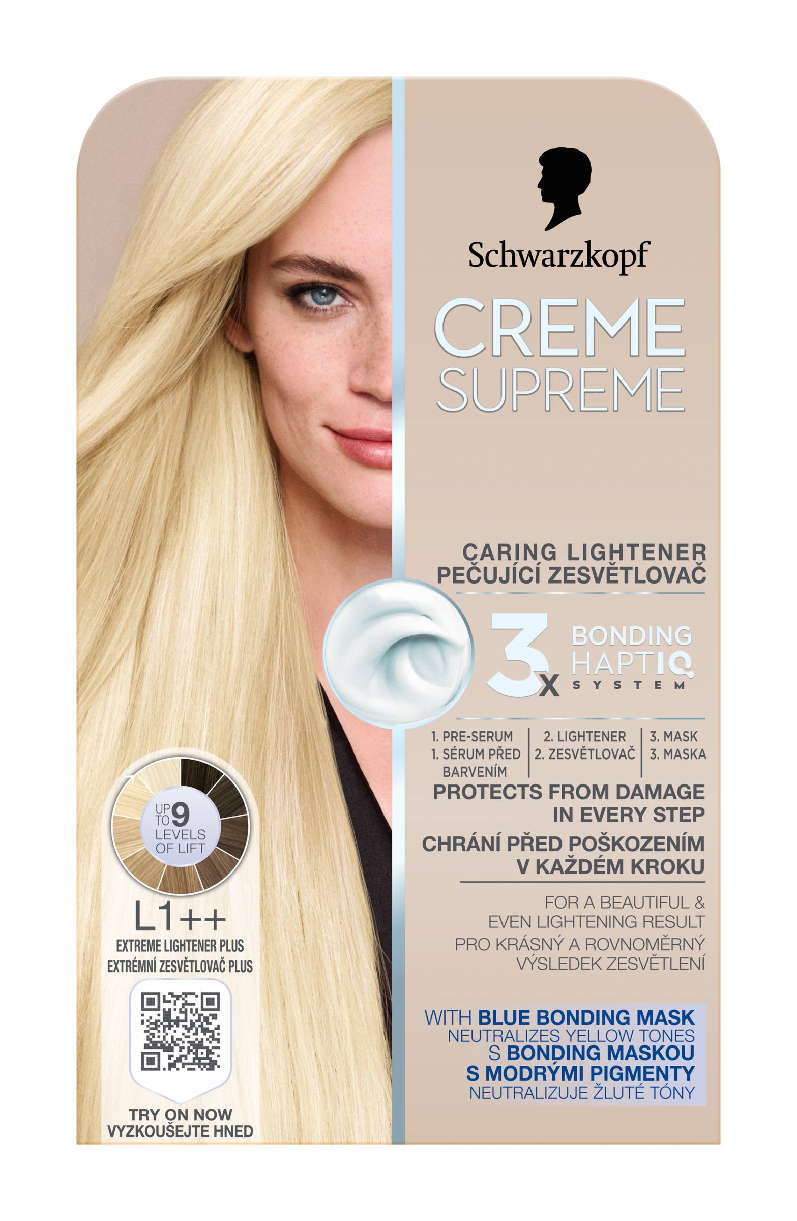 Schwarzkopf Creme Supreme L1++ Extrémní zesvětlovač plus - Vysněná barva vlasů s péčí, kterou si zasloužíte. Tento pečující zesvětlovač s technologií 3× Bonding HaptIQ System poskytuje intenzivní ochranu a péči, díky čemuž zajišťuje krásný a jednotný výsledek zesvětlení a zároveň neutralizuje žluté tóny.