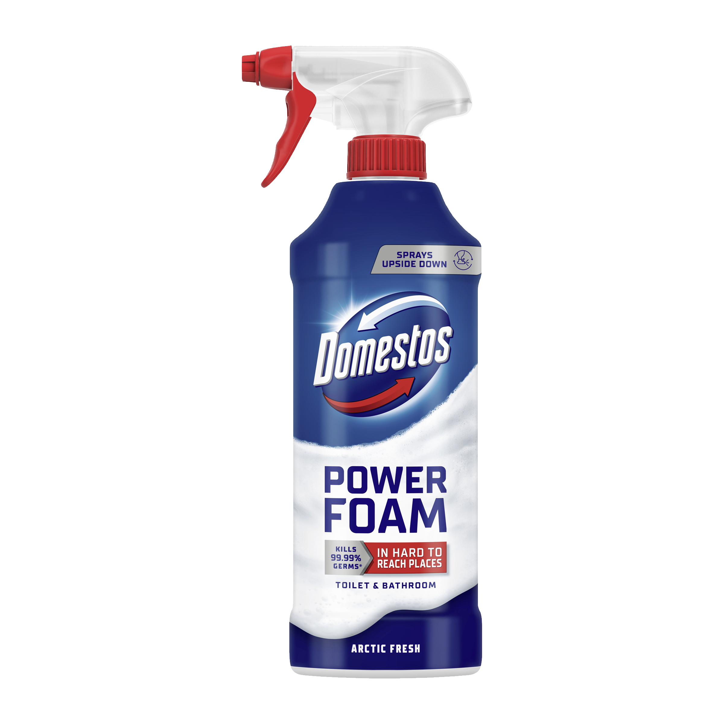 Čisticí dezinfekční pěna Domestos Power Foam Arctic Fresh mění způsob, jakým přistupujete k úklidu koupelny i toalety. Tento revoluční čistič ve formě husté aktivní pěny s inovativním rozprašovačem dosáhne i na těžko dostupná místa — jednoduše jej otočíte vzhůru nohama a aplikujete přesně tam, kde je potřeba. Domestos Power Foam účinně odstraňuje 99,9 % bakterií a obalených virů*, zatočí s vodním kamenem, mýdlovými skvrnami i dalšími nečistotami. Navíc neobsahuje chlór, je biologicky odbouratelný a provoní prostor svěží vůní Arctic Fresh. Ideální pomocník pro hygienicky čistou a svěží koupelnu.