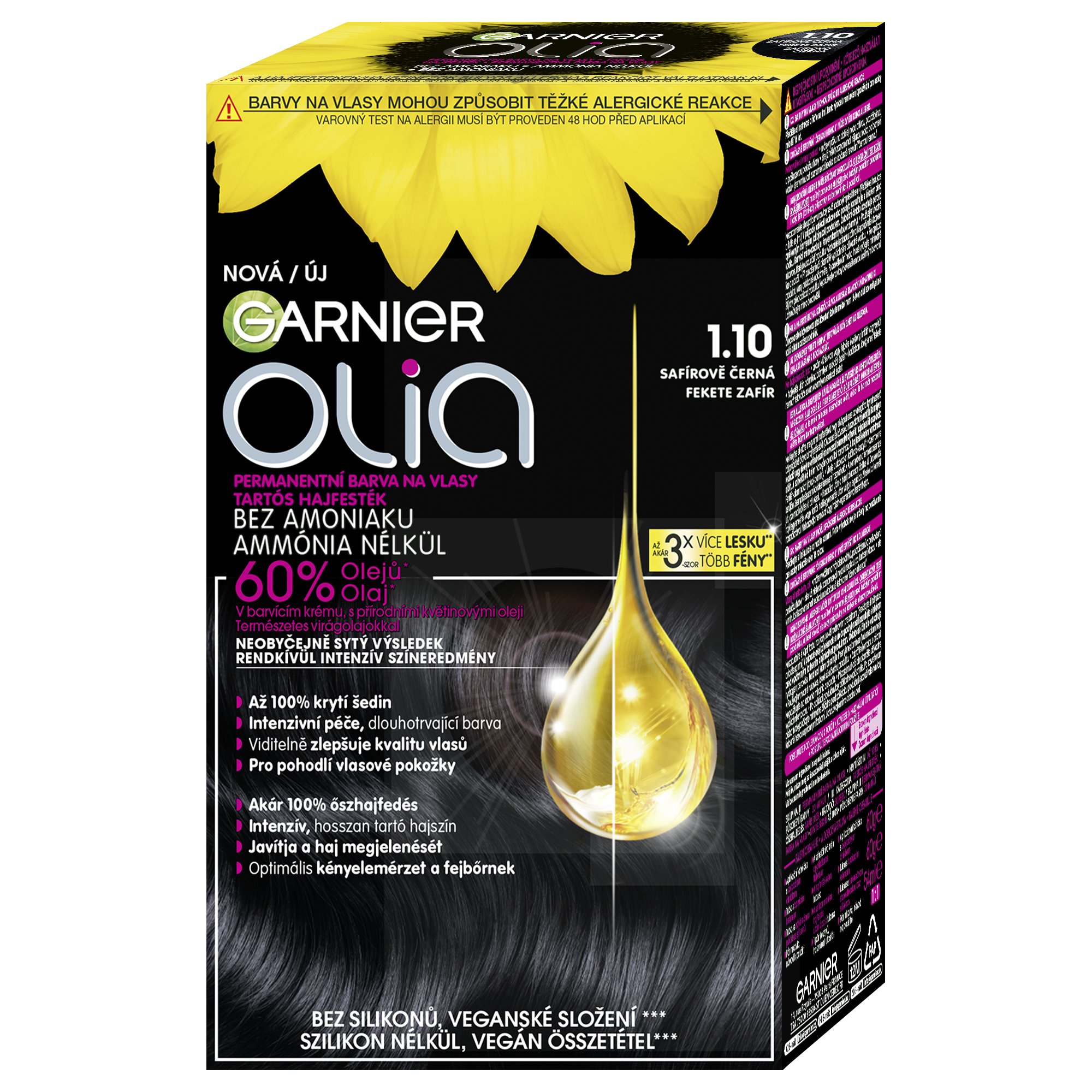 Olia od Garnier je dlouhotrvající permanentní barva na vlasy, která obsahuje 60 % olejů, neobsahuje amoniak ani silikony. Technologie olejové báze vnáší barvu hluboko do srdce vlasového vlákna a zajišťuje úžasně intenzivní výsledek. Součástí balení je nově také aplikátor, který usnadňuje aplikaci. Olia kryje až 100 % šedin. Její intenzivní péče viditelně zlepšuje kvalitu vlasů a přináší komfort pokožce hlavy.