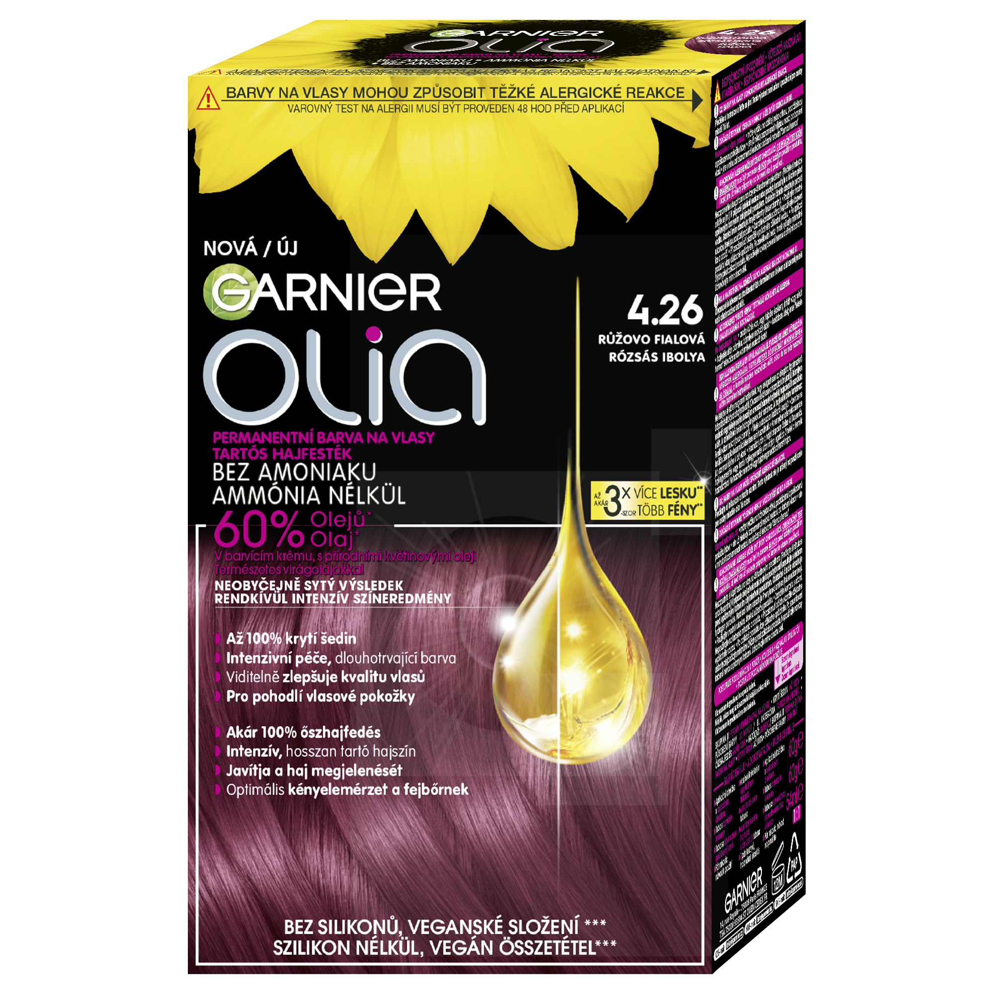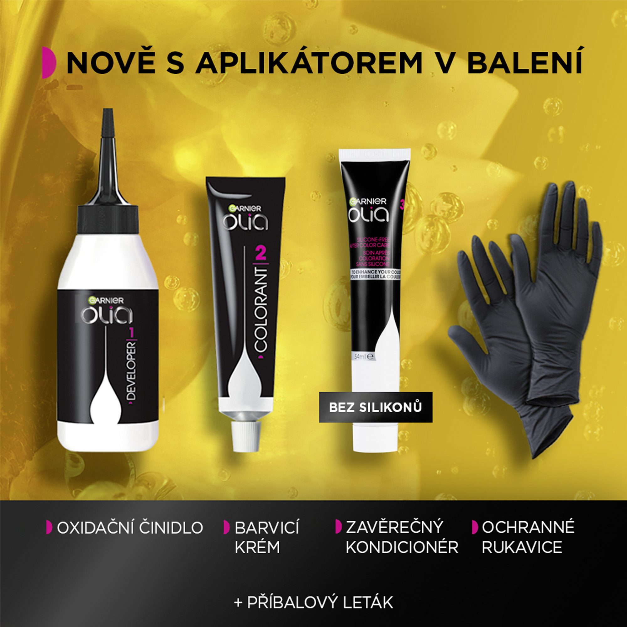 Olia od Garnier je dlouhotrvající permanentní barva na vlasy, která obsahuje 60 % olejů, neobsahuje amoniak ani silikony. Technologie olejové báze vnáší barvu hluboko do srdce vlasového vlákna a zajišťuje úžasně intenzivní výsledek. Součástí balení je nově také aplikátor, který usnadňuje aplikaci. Olia kryje až 100 % šedin. Její intenzivní péče viditelně zlepšuje kvalitu vlasů a přináší komfort pokožce hlavy.