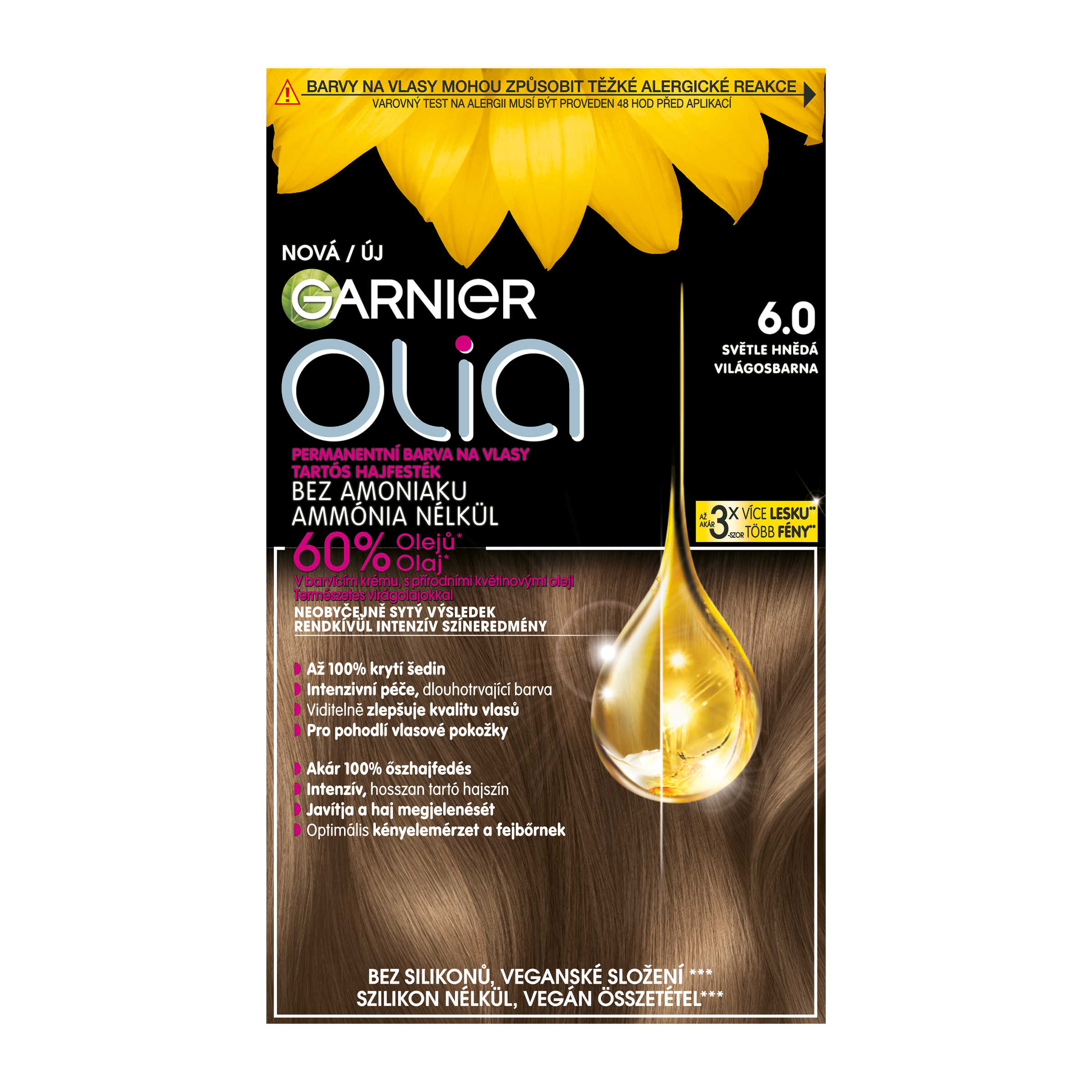 Olia od Garnier je dlouhotrvající permanentní barva na vlasy, která obsahuje 60 % olejů, neobsahuje amoniak ani silikony. Technologie olejové báze vnáší barvu hluboko do srdce vlasového vlákna a zajišťuje neobyčejně sytý výsledek. Součástí balení je nově také aplikátor, který usnadňuje aplikaci. Olia kryje až 100 % šedin. Její intenzivní péče viditelně zlepšuje kvalitu vlasů a přináší komfort pokožce hlavy.