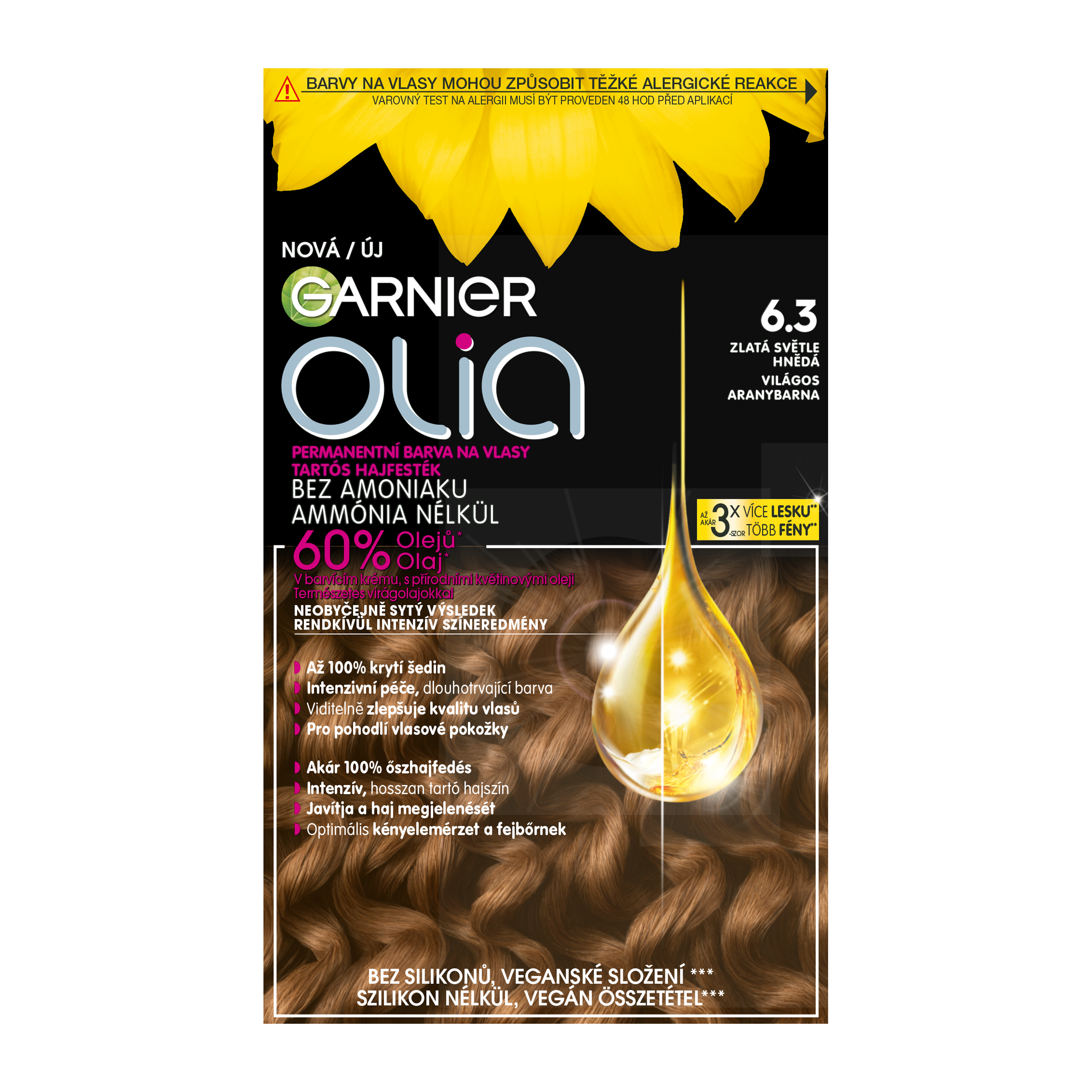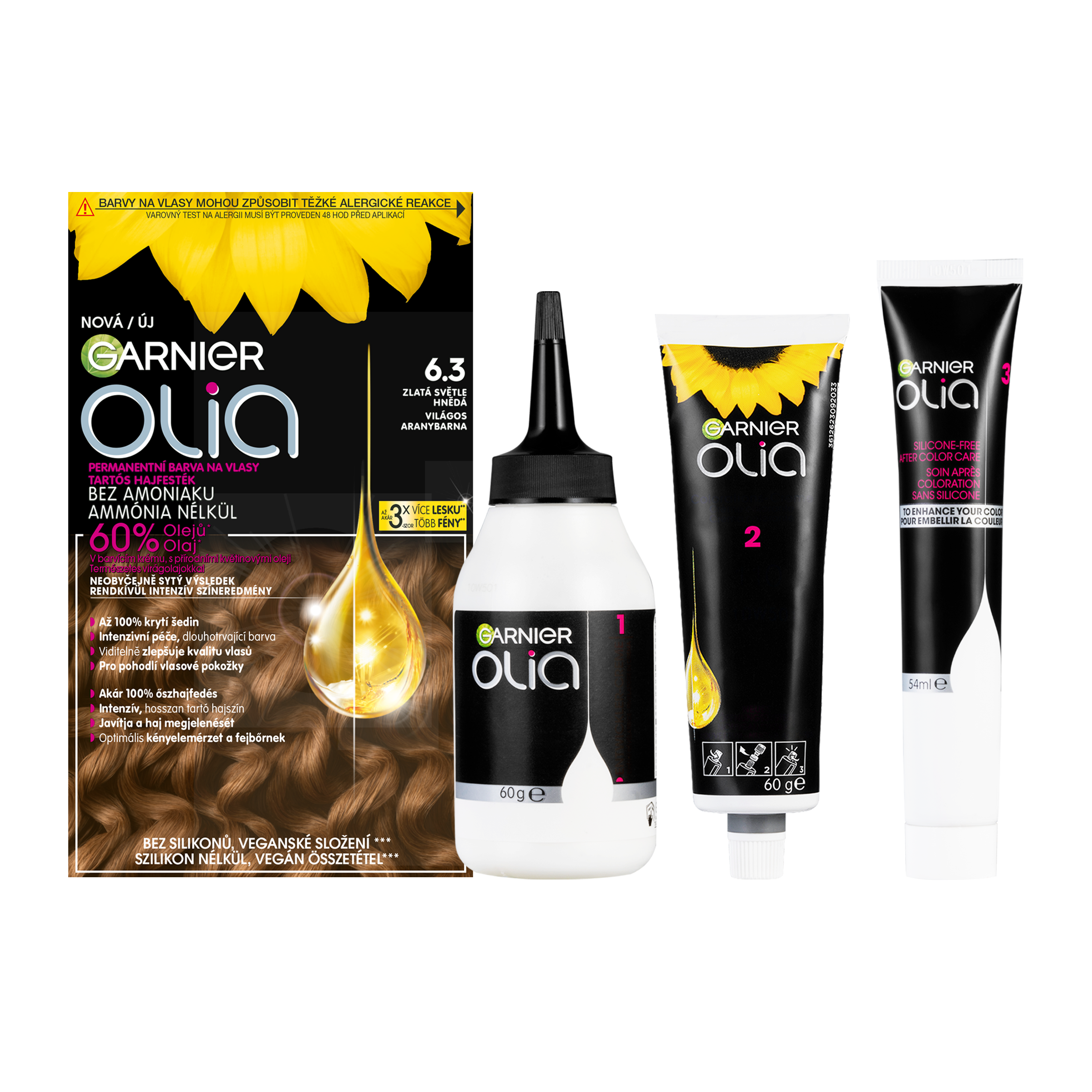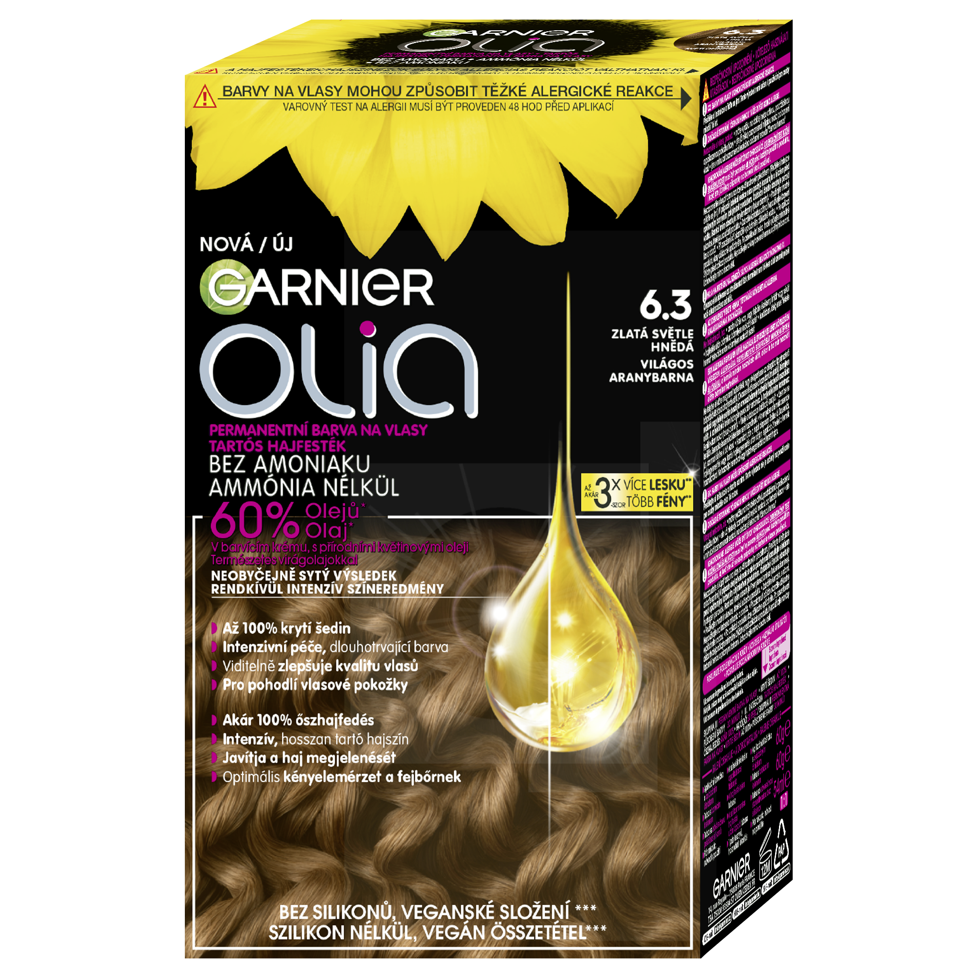 Olia od Garnier je dlouhotrvající permanentní barva na vlasy, která obsahuje 60 % olejů, neobsahuje amoniak ani silikony. Technologie olejové báze vnáší barvu hluboko do srdce vlasového vlákna a zajišťuje úžasně intenzivní výsledek. Součástí balení je nově také aplikátor, který usnadňuje aplikaci. Olia kryje až 100 % šedin. Její intenzivní péče viditelně zlepšuje kvalitu vlasů a přináší komfort pokožce hlavy.