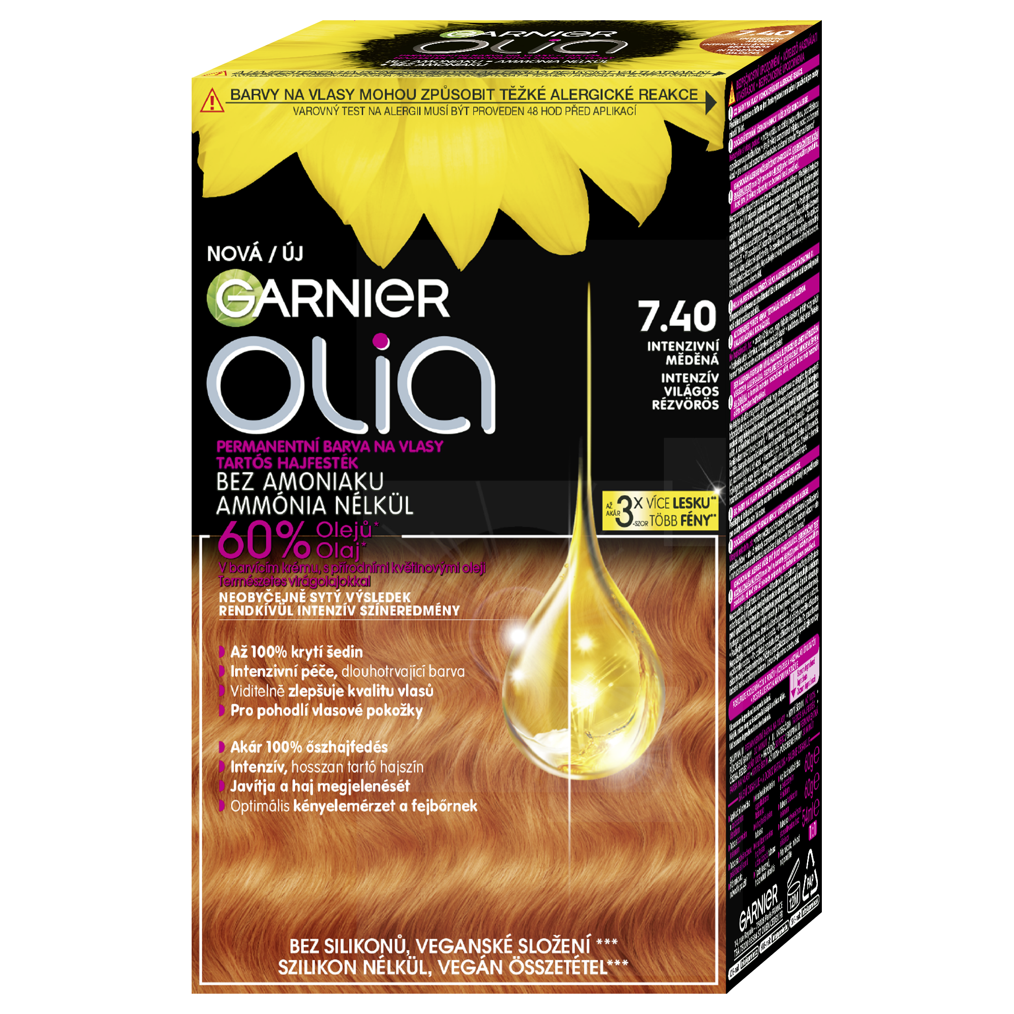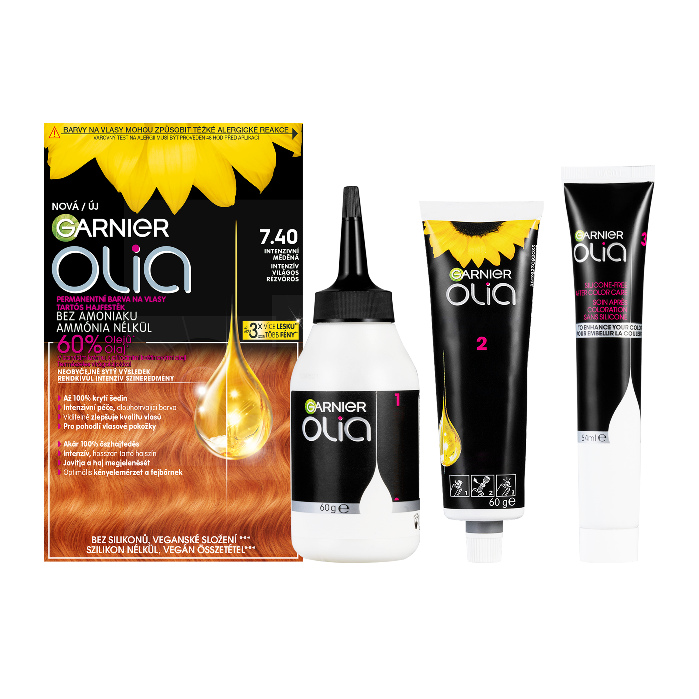 Olia od Garnier je dlouhotrvající permanentní barva na vlasy, která obsahuje 60 % olejů, neobsahuje amoniak ani silikony. Technologie olejové báze vnáší barvu hluboko do srdce vlasového vlákna a zajišťuje úžasně intenzivní výsledek. Součástí balení je nově také aplikátor, který usnadňuje aplikaci. Olia kryje až 100 % šedin. Její intenzivní péče viditelně zlepšuje kvalitu vlasů a přináší komfort pokožce hlavy.