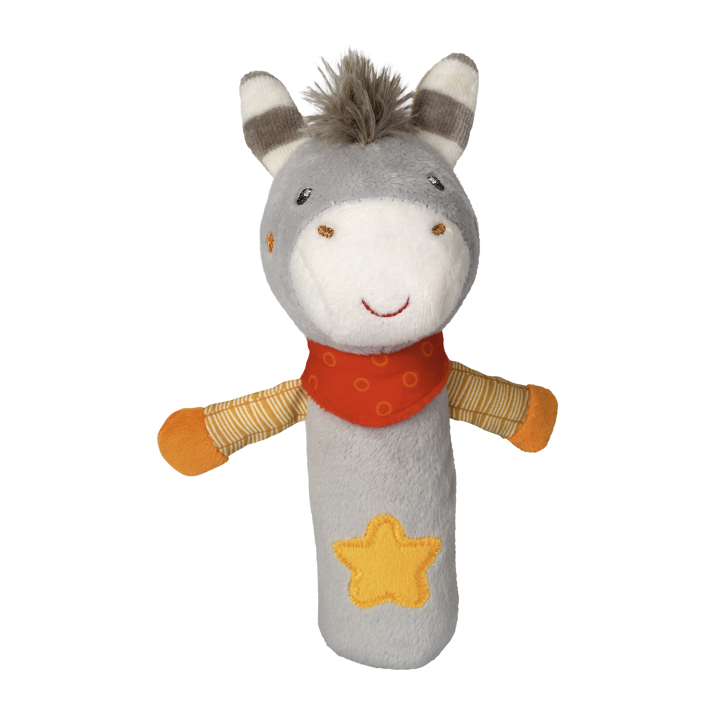 Hračka, která podporuje vývoj hmatu. Na držení a hraní. Vydává pískací zvuky. Velikost 24 cm. Pro děti od 3 měs.+