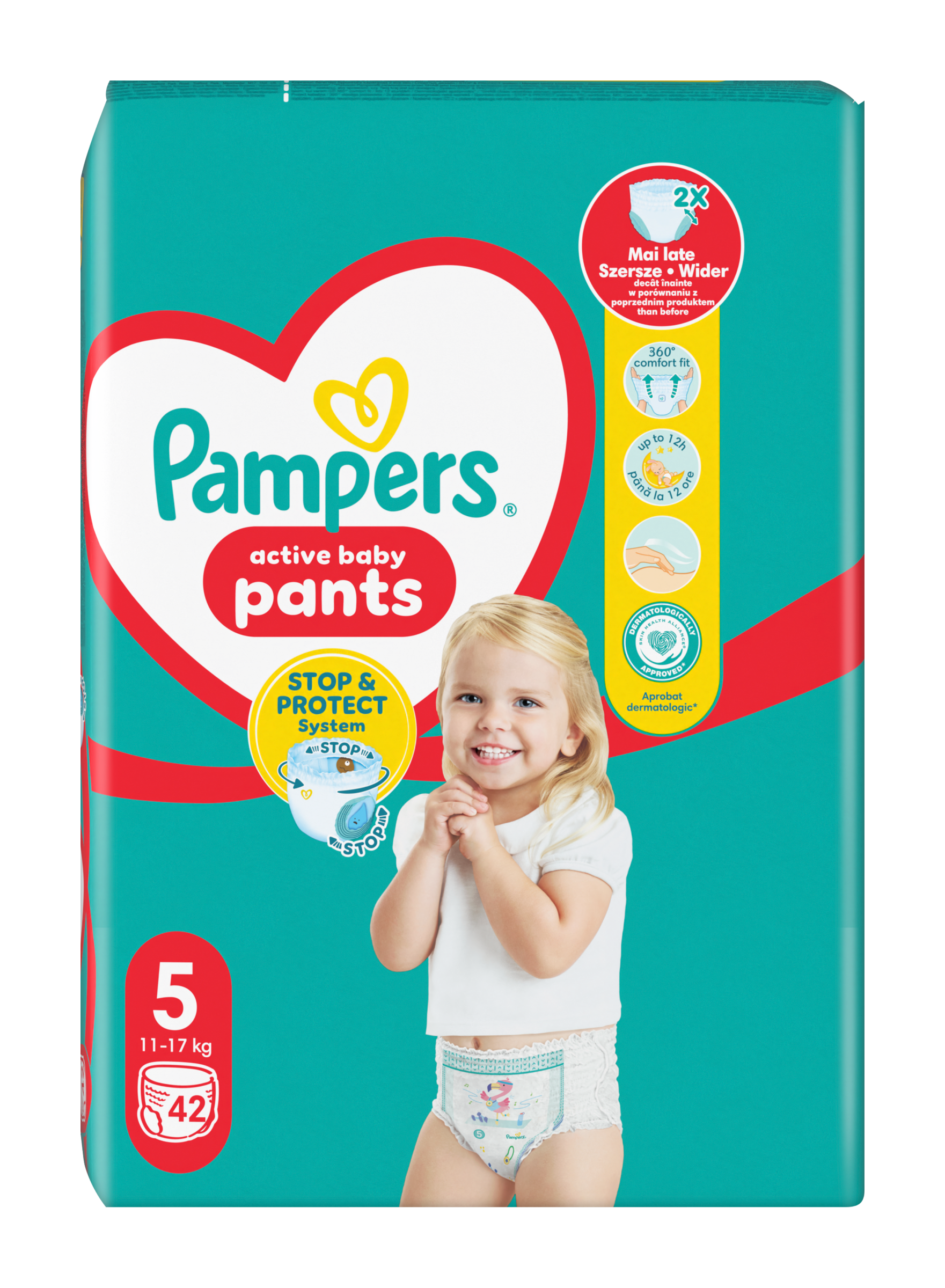 Když vaše děťátko začne být aktivnější, chcete plenku, která udrží krok s jeho novými pohyby. Plenkové kalhotky Pampers Active Baby Pants s revolučním systémem Stop & Protect nabízejí vynikající úplnou ochranu před protečením po celý den i noc a bez ohledu na polohu vašeho děťátka. Plenkové kalhotky Pampers Active Baby Pants se systémem Stop & Protect mají 2× širší* manžetky na nožičkách, které pomáhají předcházet protečení kolem nožiček, kapsu, která pomáhá zabránit protečení vzadu, 360° pružný pas, který se přizpůsobí tvaru těla vašeho děťátka při jakémkoli pohybu, a super absorpční jádro, které nabízí až 12hodinovou ochranu. Plenkové kalhotky Pampers Active Baby Pants se stejně jako všechny plenkové kalhotky od Pampers snadno vyměňují, i když je vaše děťátko neposedné: oblékají se jedním tahem a svlékají se roztrhnutím na bocích. Potom je stačí srolovat a zajistit páskem pro snadnou likvidaci. Stejně jako pro vás je i pro Pampers bezpečnost vašeho děťátka prioritou: Plenkové kalhotky Pampers Active Baby Pants jsou dermatologicky testované a schválené dermatology z organizace Skin Health Alliance. Chcete se o složení výrobků Pampers dozvědět víc? Navštivte pampers.cz. *v porovnání s předchozí plenkou