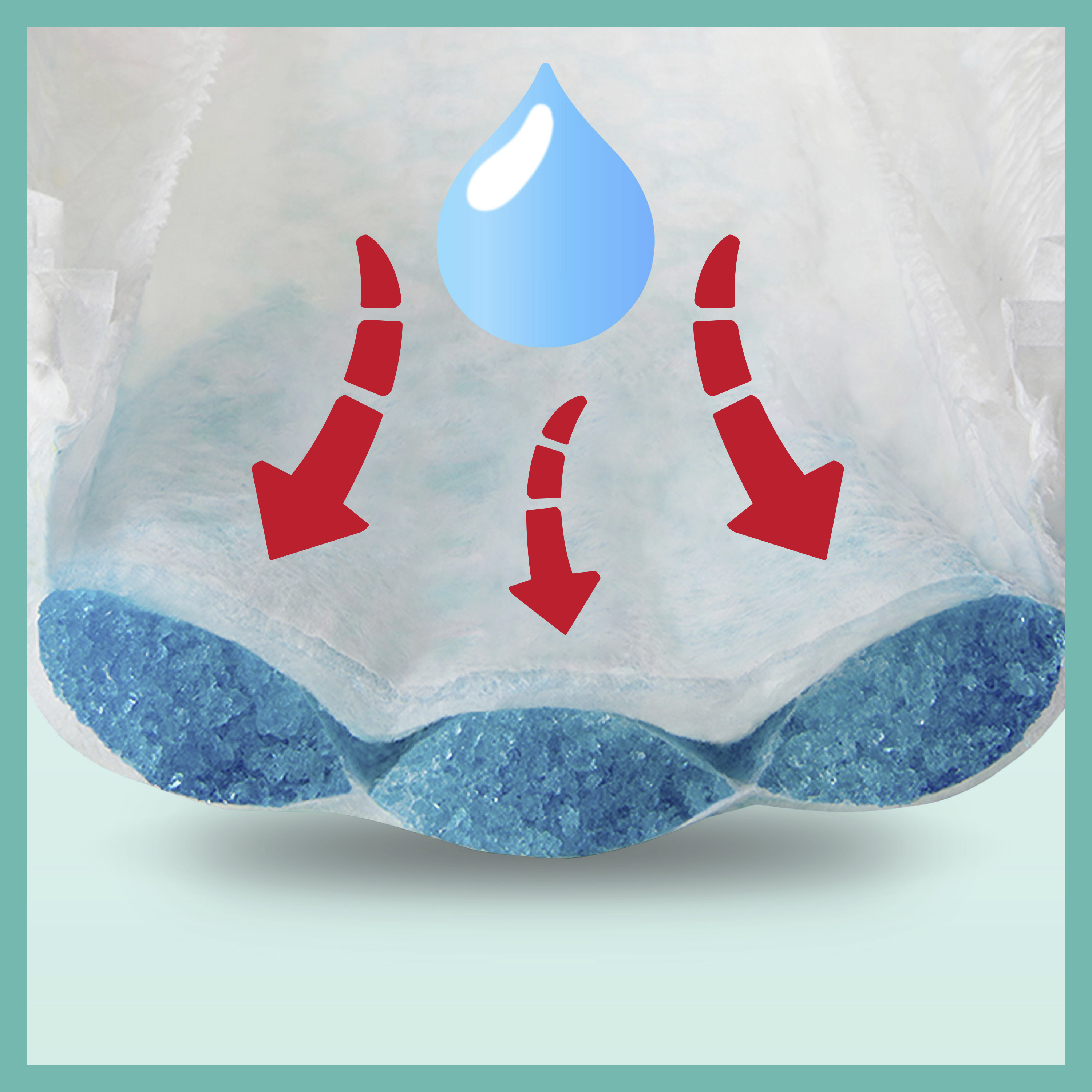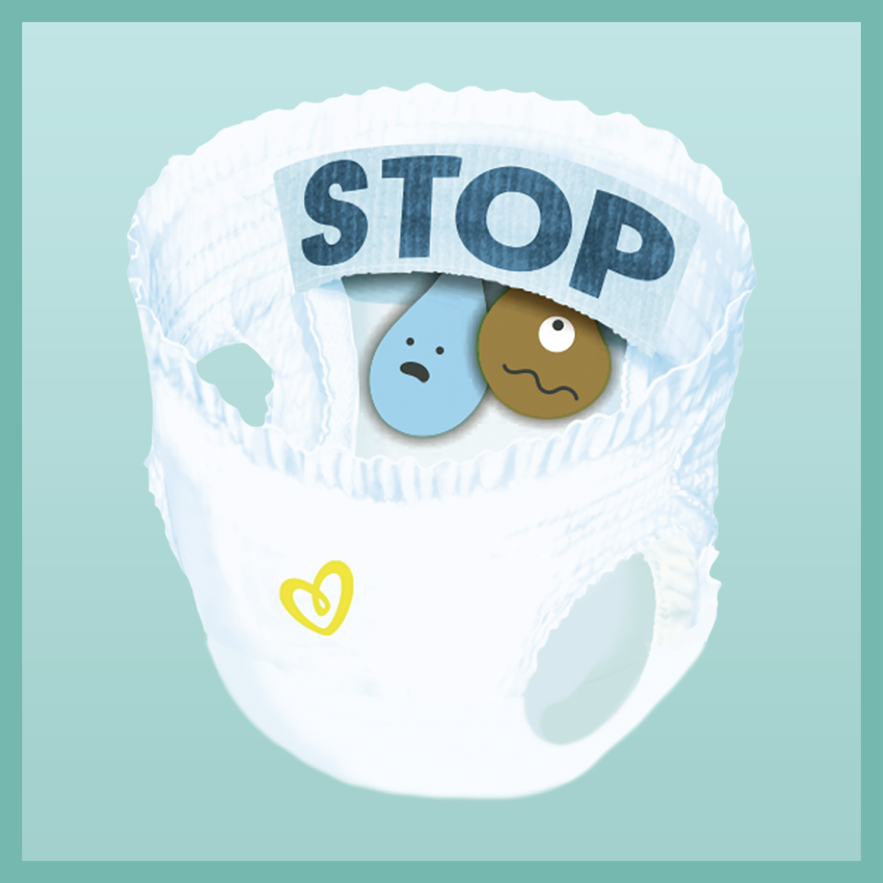 - Poskytují trojnásobnou ochranu se systémem Stop & Protect: 2× širší* manžetky, které pomáhají předcházet protečení po stranách, kapsa, která pomáhá předcházet protečení vzadu, a komfortní ochrana 360° (*v porovnání s předchozí plenkou)