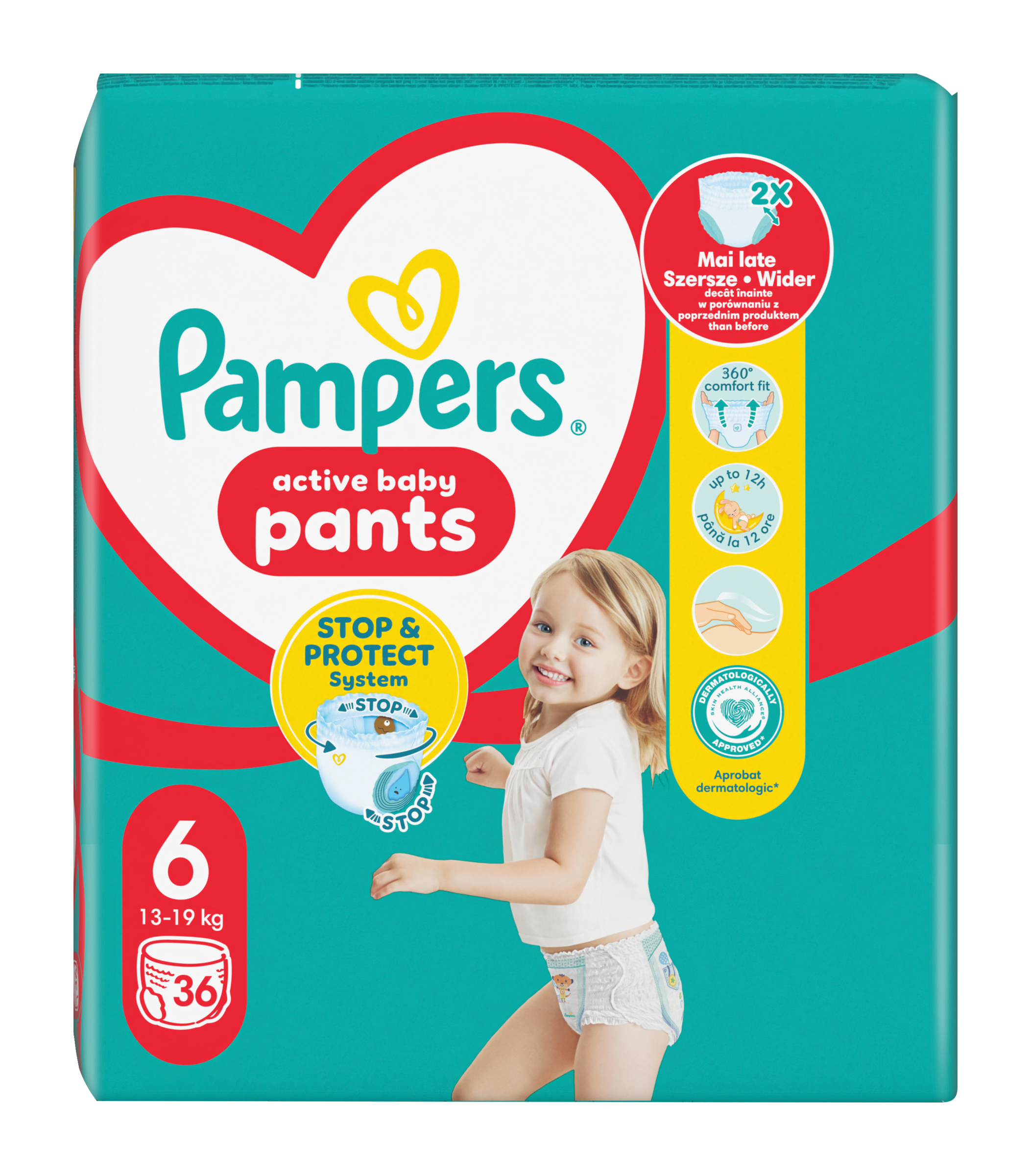 Když vaše děťátko začne být aktivnější, chcete plenku, která udrží krok s jeho novými pohyby. Plenkové kalhotky Pampers Active Baby Pants s revolučním systémem Stop & Protect nabízejí vynikající úplnou ochranu před protečením po celý den i noc a bez ohledu na polohu vašeho děťátka. Plenkové kalhotky Pampers Active Baby Pants se systémem Stop & Protect mají 2× širší* manžetky na nožičkách, které pomáhají předcházet protečení kolem nožiček, kapsu, která pomáhá zabránit protečení vzadu, 360° pružný pas, který se přizpůsobí tvaru těla vašeho děťátka při jakémkoli pohybu, a super absorpční jádro, které nabízí až 12hodinovou ochranu. Plenkové kalhotky Pampers Active Baby Pants se stejně jako všechny plenkové kalhotky od Pampers snadno vyměňují, i když je vaše děťátko neposedné: oblékají se jedním tahem a svlékají se roztrhnutím na bocích. Potom je stačí srolovat a zajistit páskem pro snadnou likvidaci. Stejně jako pro vás je i pro Pampers bezpečnost vašeho děťátka prioritou: Plenkové kalhotky Pampers Active Baby Pants jsou dermatologicky testované a schválené dermatology z organizace Skin Health Alliance. Chcete se o složení výrobků Pampers dozvědět víc? Navštivte pampers.cz. *v porovnání s předchozí plenkou