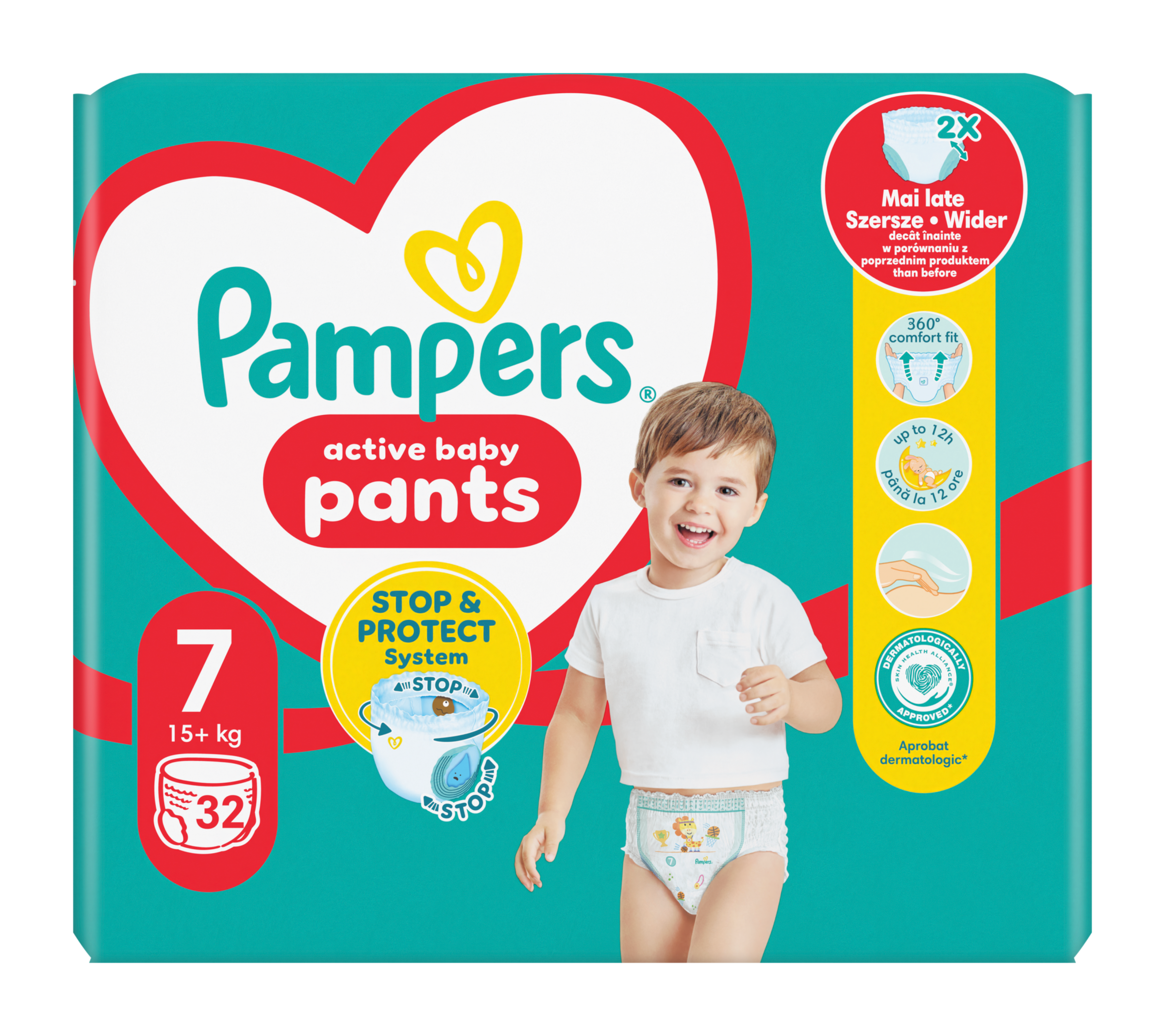 Když vaše děťátko začne být aktivnější, chcete plenku, která udrží krok s jeho novými pohyby. Plenkové kalhotky Pampers Active Baby Pants s revolučním systémem Stop & Protect nabízejí vynikající úplnou ochranu před protečením po celý den i noc a bez ohledu na polohu vašeho děťátka. Plenkové kalhotky Pampers Active Baby Pants se systémem Stop & Protect mají 2× širší* manžetky na nožičkách, které pomáhají předcházet protečení kolem nožiček, kapsu, která pomáhá zabránit protečení vzadu, 360° pružný pas, který se přizpůsobí tvaru těla vašeho děťátka při jakémkoli pohybu, a super absorpční jádro, které nabízí až 12hodinovou ochranu. Plenkové kalhotky Pampers Active Baby Pants se stejně jako všechny plenkové kalhotky od Pampers snadno vyměňují, i když je vaše děťátko neposedné: oblékají se jedním tahem a svlékají se roztrhnutím na bocích. Potom je stačí srolovat a zajistit páskem pro snadnou likvidaci. Stejně jako pro vás je i pro Pampers bezpečnost vašeho děťátka prioritou: Plenkové kalhotky Pampers Active Baby Pants jsou dermatologicky testované a schválené dermatology z organizace Skin Health Alliance. Chcete se o složení výrobků Pampers dozvědět víc? Navštivte pampers.cz. *v porovnání s předchozí plenkou