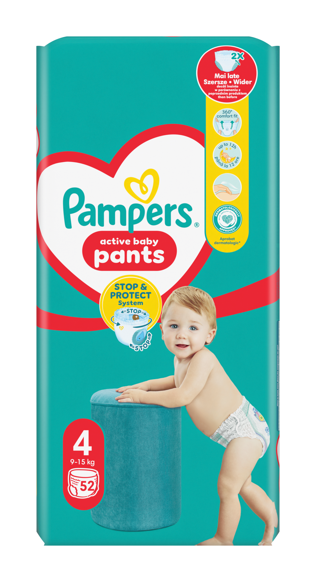 Když vaše děťátko začne být aktivnější, chcete plenku, která udrží krok s jeho novými pohyby. Plenkové kalhotky Pampers Active Baby Pants s revolučním systémem Stop & Protect nabízejí vynikající úplnou ochranu před protečením po celý den i noc a bez ohledu na polohu vašeho děťátka. Plenkové kalhotky Pampers Active Baby Pants se systémem Stop & Protect mají 2× širší* manžetky na nožičkách, které pomáhají předcházet protečení kolem nožiček, kapsu, která pomáhá zabránit protečení vzadu, 360° pružný pas, který se přizpůsobí tvaru těla vašeho děťátka při jakémkoli pohybu, a super absorpční jádro, které nabízí až 12hodinovou ochranu. Plenkové kalhotky Pampers Active Baby Pants se stejně jako všechny plenkové kalhotky od Pampers snadno vyměňují, i když je vaše děťátko neposedné: oblékají se jedním tahem a svlékají se roztrhnutím na bocích. Potom je stačí srolovat a zajistit páskem pro snadnou likvidaci. Stejně jako pro vás je i pro Pampers bezpečnost vašeho děťátka prioritou: Plenkové kalhotky Pampers Active Baby Pants jsou dermatologicky testované a schválené dermatology z organizace Skin Health Alliance. Chcete se o složení výrobků Pampers dozvědět víc? Navštivte pampers.cz. *v porovnání s předchozí plenkou