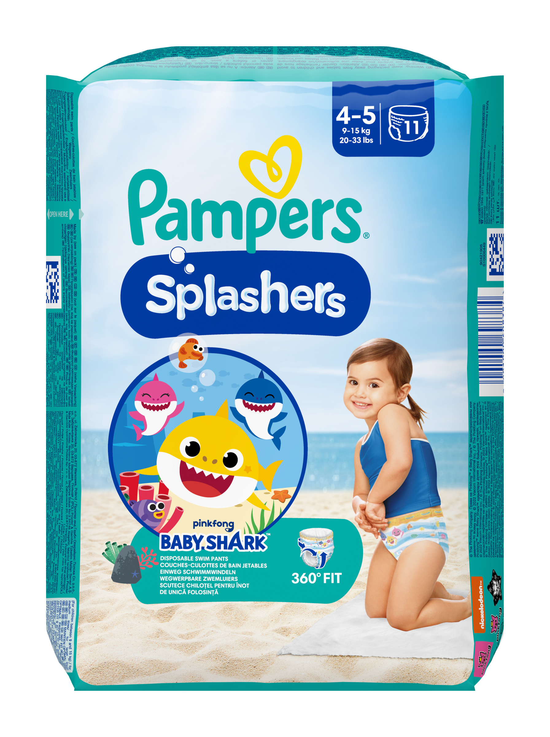 Vaše děťátko může v jednorázových plenkových kalhotkách Pampers Splashers bezstarostně dovádět i ve vodě. Na rozdíl od běžných plenek Pampers Splashers ve vodě nenasáknou: padnou jako plavky a chrání jako Pampers. Díky nádhernému designu Baby Shark se brzy stanou pro jeho malé fanoušky nezbytností. Plenkové kalhotky Pampers Splashers Dual Protection mají dvojité manžety proti protečení, které spolehlivě chrání i ve vodě. Díky nim pohodlně padnou kolem nožiček vašeho dítěte a pomohou zadržet nečistoty. Pampers Splashers jsou proto ideální plenkové kalhotky do bazénu, na pláž, do akvaparku apod. Jejich jedinečný 360° pružný pas pohodlně sedí a snadno se natahuje a svléká - i když je mokrý. Pampers Splashers jsou také vybaveny bočními pásy, které se dají snadno roztrhnout pro rychlou likvidaci a méně nepořádku.