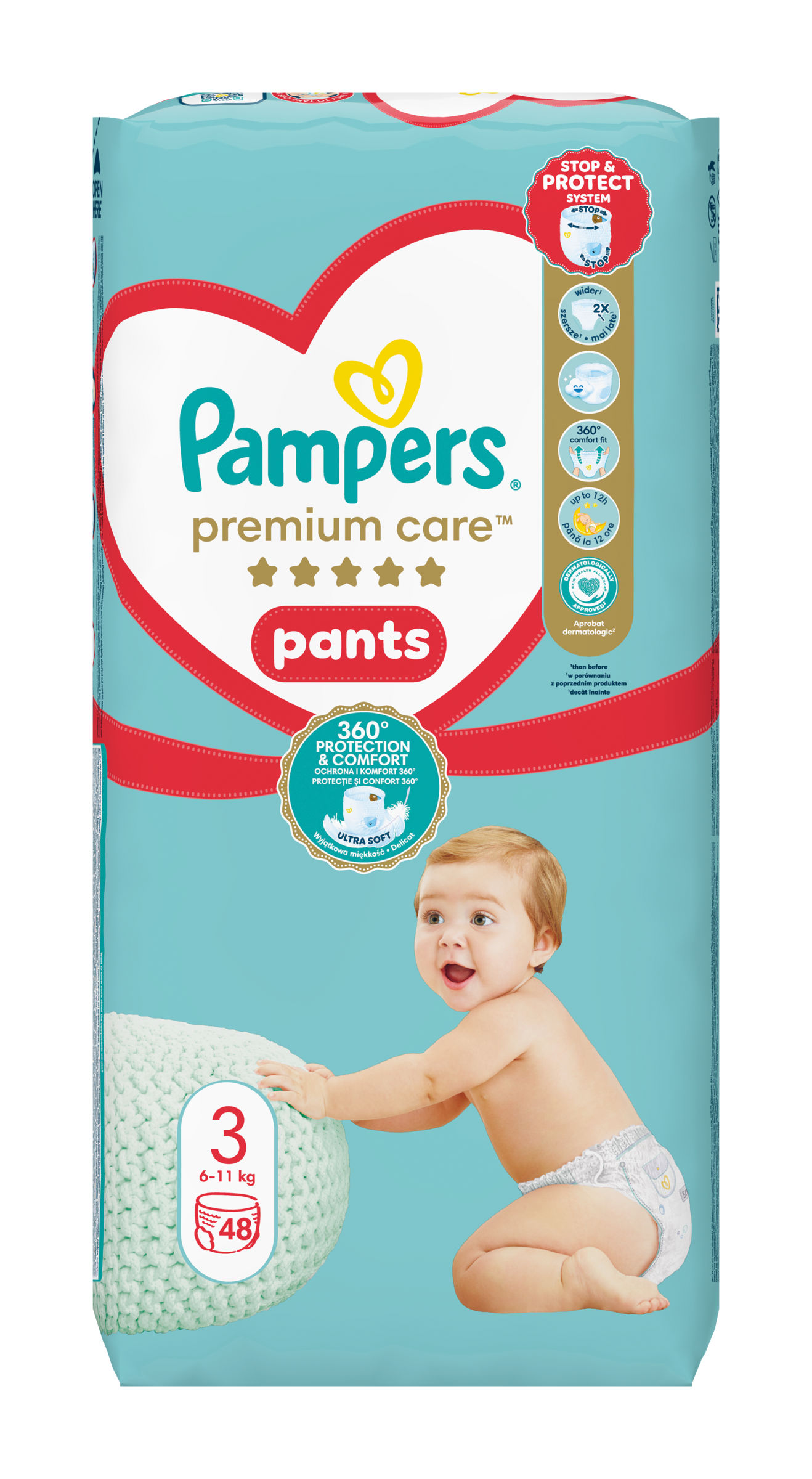 Jakmile začne být vaše děťátko aktivnější, budete potřebovat takovou plenku, která mu pohodlně padne a dokáže je spolehlivě chránit při každém pohybu. Dopřejte svému děťátku nejlepší pohodlí a ochranu před protečením od Pampers s plenkovými kalhotkami Pampers Premium Care Pants: jejich 2× širší* hebké manžetky chrání před zarudnutím a protečení, jejich ultra hebký pružný pas 360° FIT se přizpůsobuje pohybům vašeho děťátka při objevování světa a jejich jedinečná kapsa Stop & Protect pomáhá zabránit protečení vzadu. Plenkové kalhotky Pampers Premium Care se stejně jako všechny plenkové kalhotky od Pampers snadno přebalují, i když je vaše děťátko neposedné: oblékají se jedním tahem a svlékají se roztrhnutím na bocích. Potom je stačí srolovat a zajistit páskem pro snadnou likvidaci. Stejně jako pro vás je i pro Pampers bezpečnost vašeho děťátka prioritou: Plenkové kalhotky Pampers Premium Care Pants jsou dermatologicky testované a schválené dermatology z organizace Skin Health Alliance. Chcete se o složení výrobků Pampers dozvědět víc? Navštivte pampers.cz. *v porovnání s předchozím modelem.