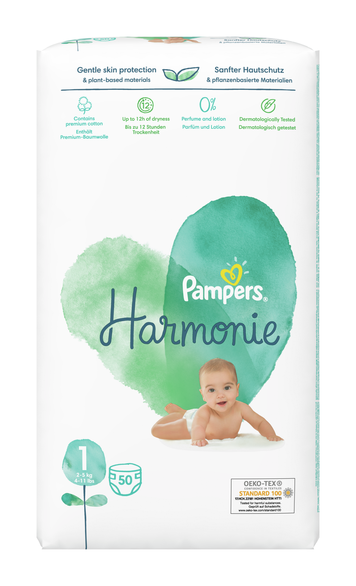 Jemná ochrana pokožky. Se složkami rostlinného původu. Plenky Pampers Harmonie jsou vyrobené z prvotřídní bavlny, hebkých rostlinných vláken a jiných pečlivě vybíraných materiálů, jsou dermatologicky testované a šetrné k pokožce vašeho děťátka. Jsou bez parfemace, neobsahují pleťové mléko ani žádné z 26 látek klasifikovaných směrnicí EU jako alergeny, a zaručují až 12 hodin sucha od Pampers, pro jistotu kvality, na kterou se rodiče mohou spolehnout. Jsou vybavené praktickým indikátorem vlhkosti od Pampers a mají roztomilý potisk: vy i vaše děťátko si je absolutně zamilujete. Plenky Pampers Harmonie se vyrábí z celulózy získávané z udržitelných zdrojů a mají jednu z nejnáročnějších certifikací na světě, Oeko-Tex Standard 100. Chcete se o složení výrobků Pampers dozvědět víc? Navštivte pampers.cz