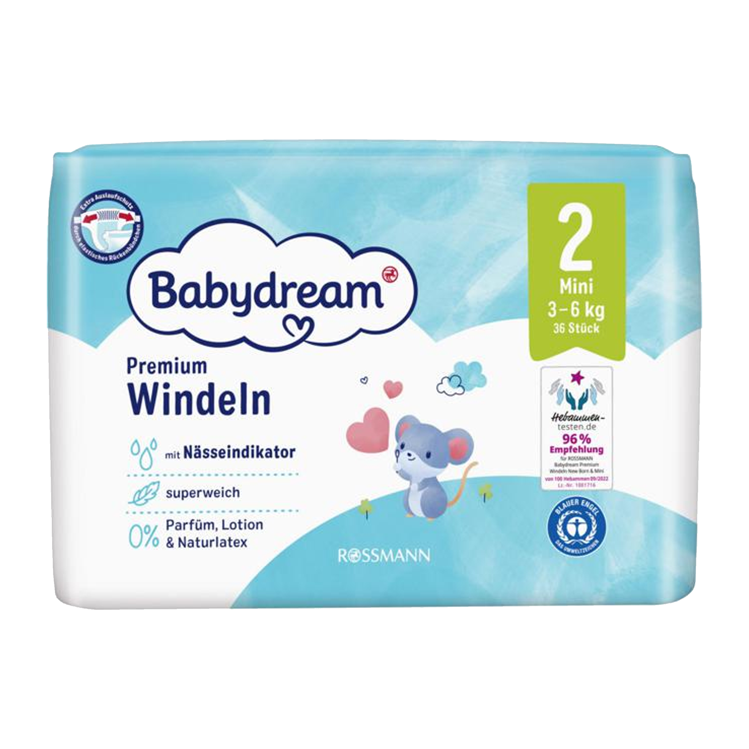 Sametově hebké jednorázové plenky Babydream Premium Mini pro děti od 3 do 6 kg poskytují optimální ochranu citlivé pokožky vašeho dítěte. Zůstávají suché až 12 hodin a mimořádně rychle absorbují tekutinu. Praktický indikátor vlhkosti vás upozorní na potřebu výměny plenky změnou barvy – zbarví se modře, když je třeba plenku vyměnit.