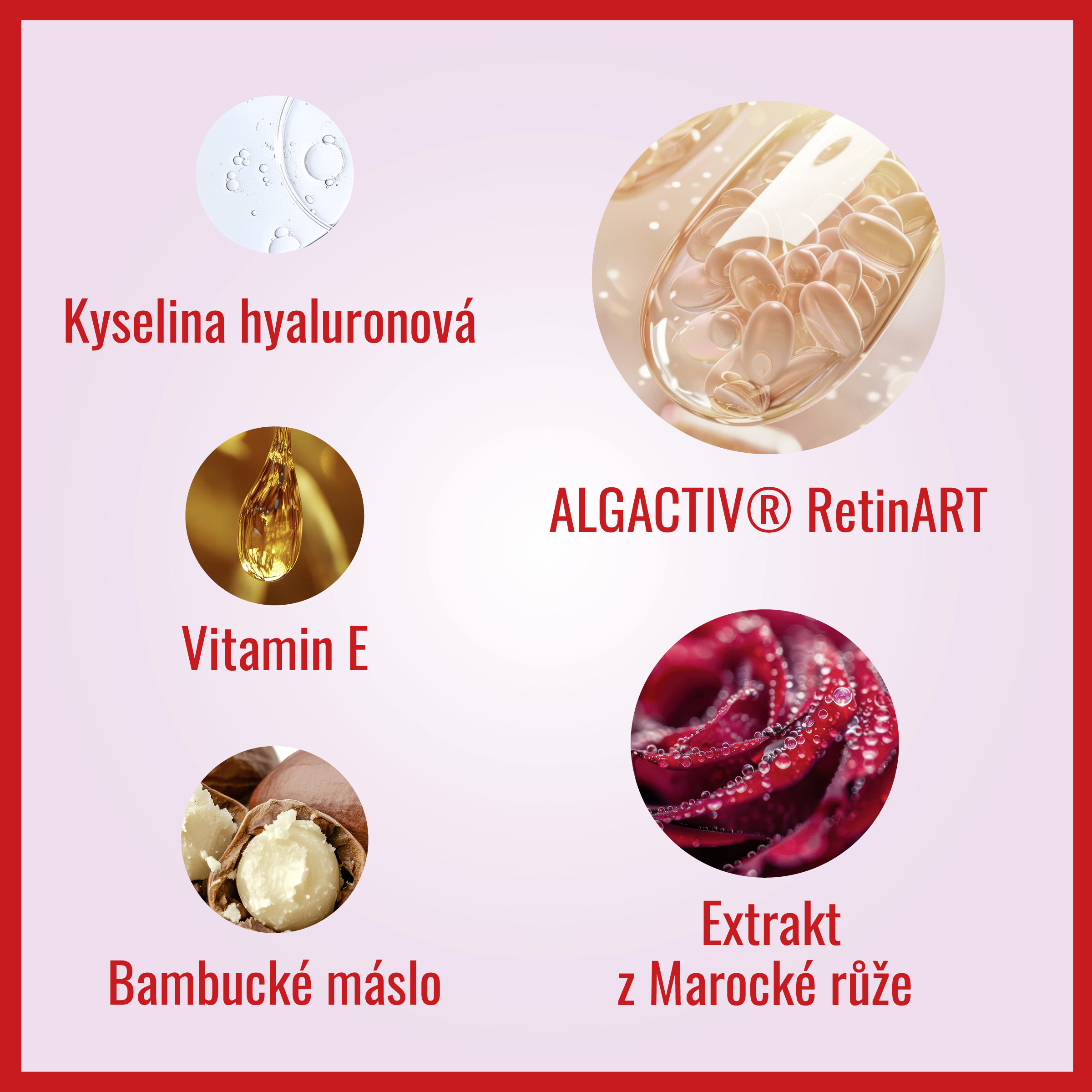 Aktivní látky: ALGACTIV® RetinART, Kyselina hyaluronová, Extrakt z Marocké růže, Vitamin E, Bambucké máslo.