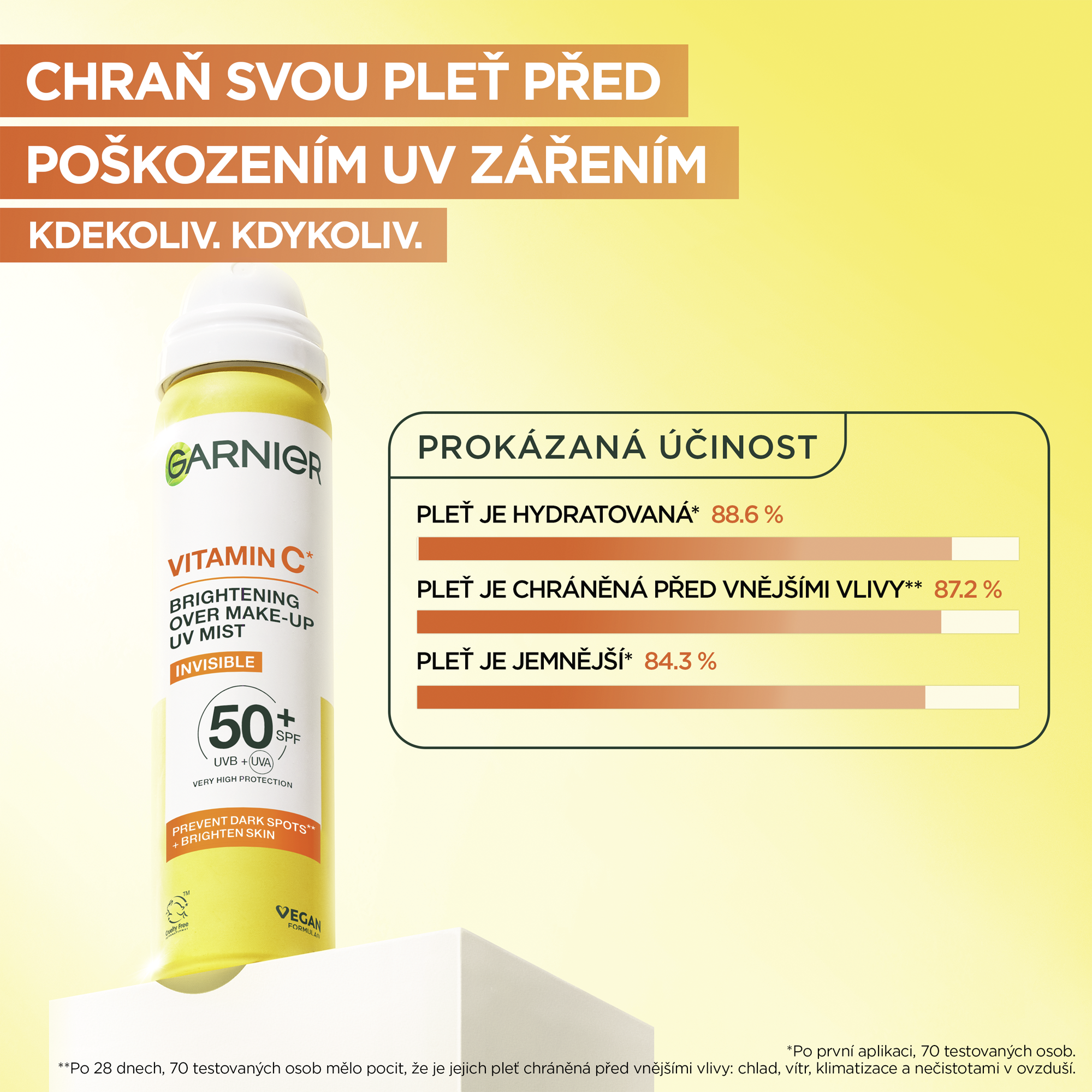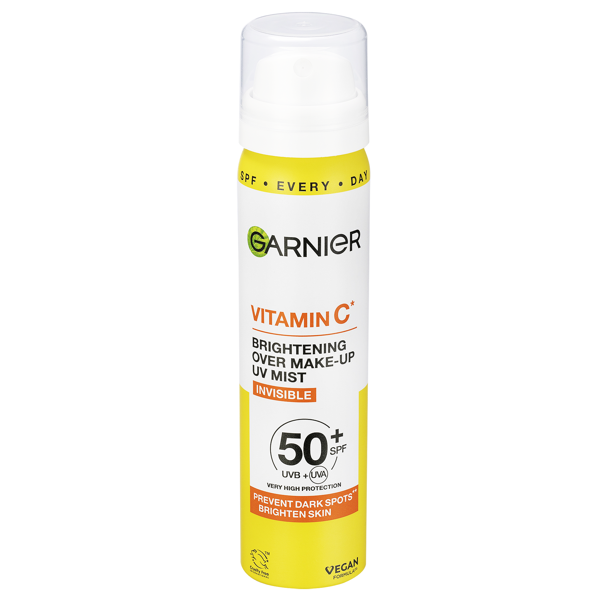 Naše Vitamin C* rozjasňující neviditelná pleťová mlha s SPF 50+ obohacená o antioxidační komplex vitamín C* + vitamín E. Mlha pomáhá předcházet vzniku tmavých skvrn a rozjasňuje pleť.
