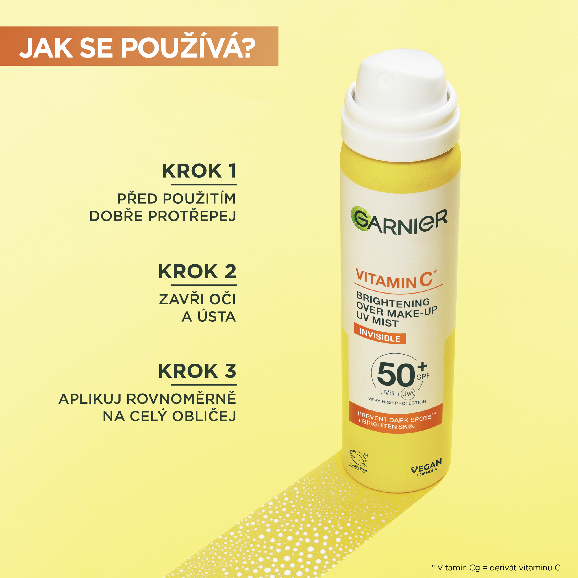 Před použitím dobře protřepej. Během aplikace zavři oči a sevři rty k sobě. Nastříkej rovnoměrně na celý obličej v minimální vzdálenosti 15 cm. Záměrně nevdechuj. V případě kontaktu se rty produkt setři. V případě podráždení očí je okamžitě a důkladně vypláchni vodou.