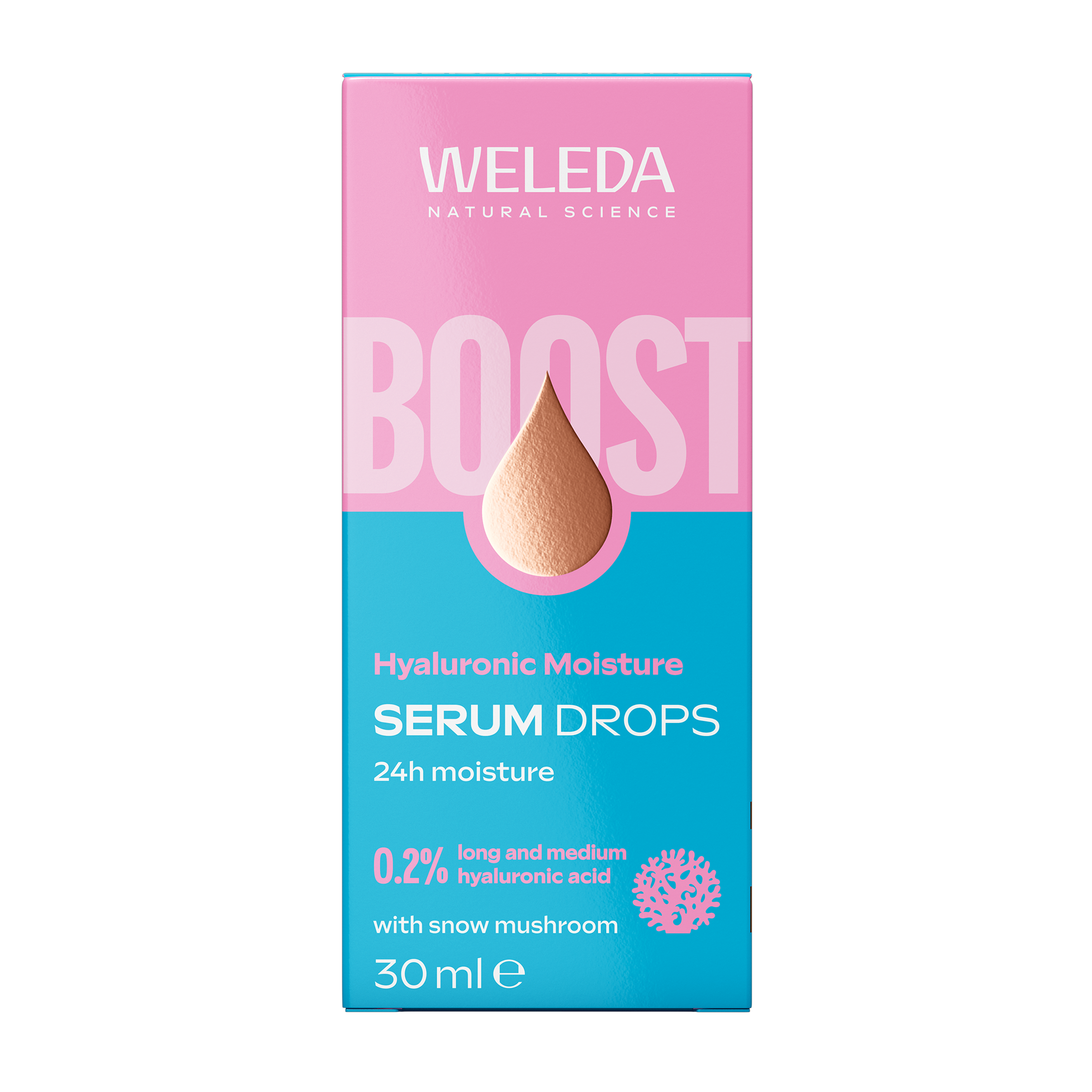 Weleda Booster Serum Drops kombinují vysoce účinné rostlinné extrakty, inovativní aktivní látky a vědeckým výzkumem podložené složení, které se přizpůsobí vaší pleti přesně podle jejích aktuálních potřeb. Díky koncentrovanému složení je můžete snadno míchat, vrstvit nebo kombinovat pro dosažení cíleného efektu, ať už vaše pleť volá po hydrataci, zklidnění nebo prostě potřebuje dodat svěží glow! Hyaluronic Moisture Serum Drops poskytují 24hodinovou intenzivní a vícestupňovou hydrataci díky duální kyselině hyaluronové a Sněžné houbě. Fermentačně získaná kyselina hyaluronová ve středně a vysokomolekulární formě (0,2 %) působí v hlubších vrstvách i na povrchu pleti, čímž efektivně obnovuje její vlhkost a pružnost. Sněžná houba (Tremella fuciformis), bohatá na adaptogenní polysacharidy, napodobuje a posiluje účinek kyseliny hyaluronové, zklidňuje a podporuje regeneraci pokožky. Sérum je ideální pro dehydratovanou, unavenou pleť s oslabenou kožní bariérou. Okamžitě osvěžuje, zjemňuje a navrací pleti plnost a zdravý glow.