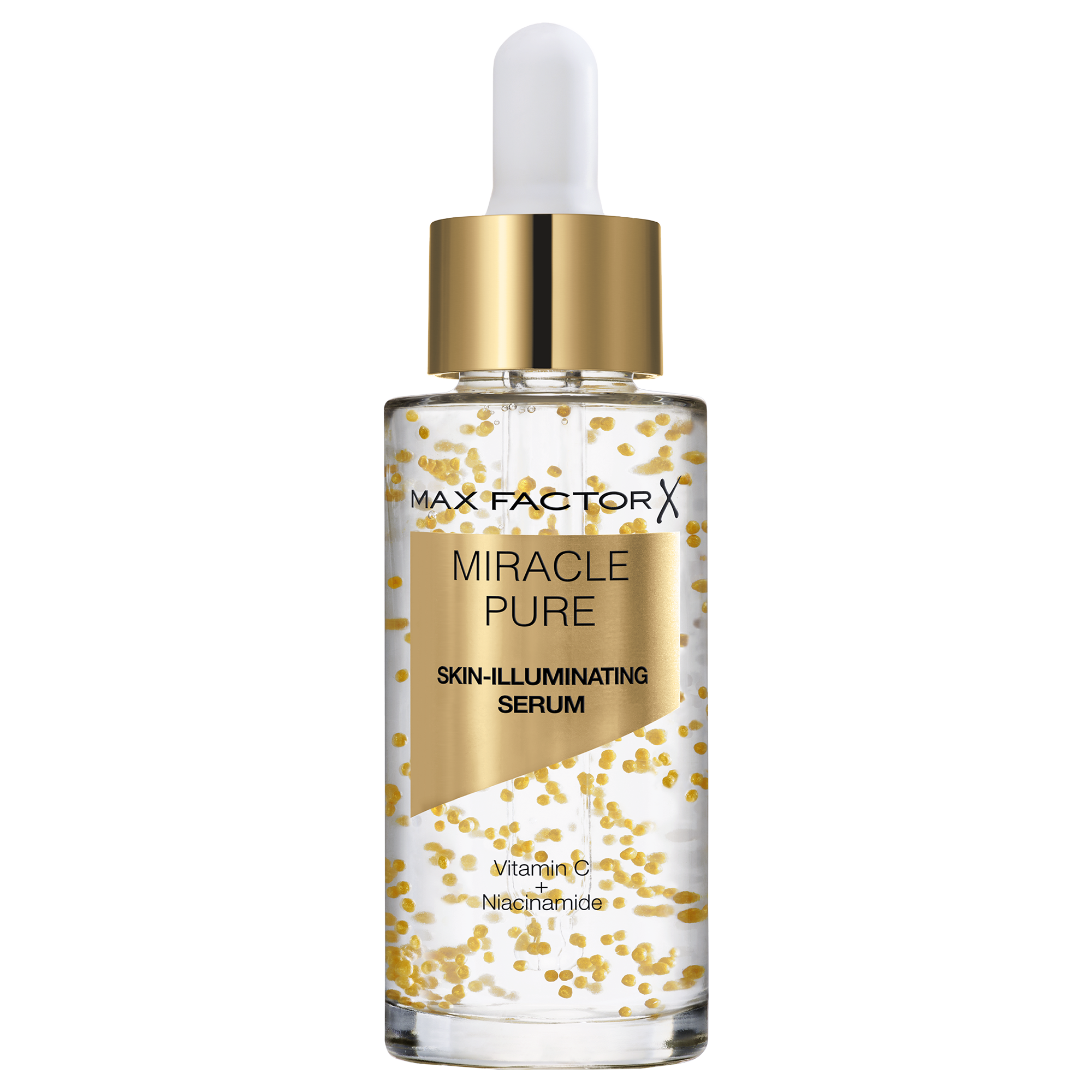 Pleťové sérum Miracle Pure je denní dávka vitamínů pro vaši pleť, která ji udrží svěží a zářivou. Pečující sérum zlepšuje stav pleti a zlaté perly s rozjasňujícími částečkami, které jsou v něm obsaženy, poskytují efekt vyživené a zářivé pleti. Sérum je klinicky testované, veganské a obohacené o vitamín C a niacinamid – formu vitamínu B3. Multifunkční sérum můžete používat samostatně, pod make-up nebo ho můžete smíchat s 1–2 kapkami make-upu, abyste zvýšili účinek péče o pleť a její rozjasnění.