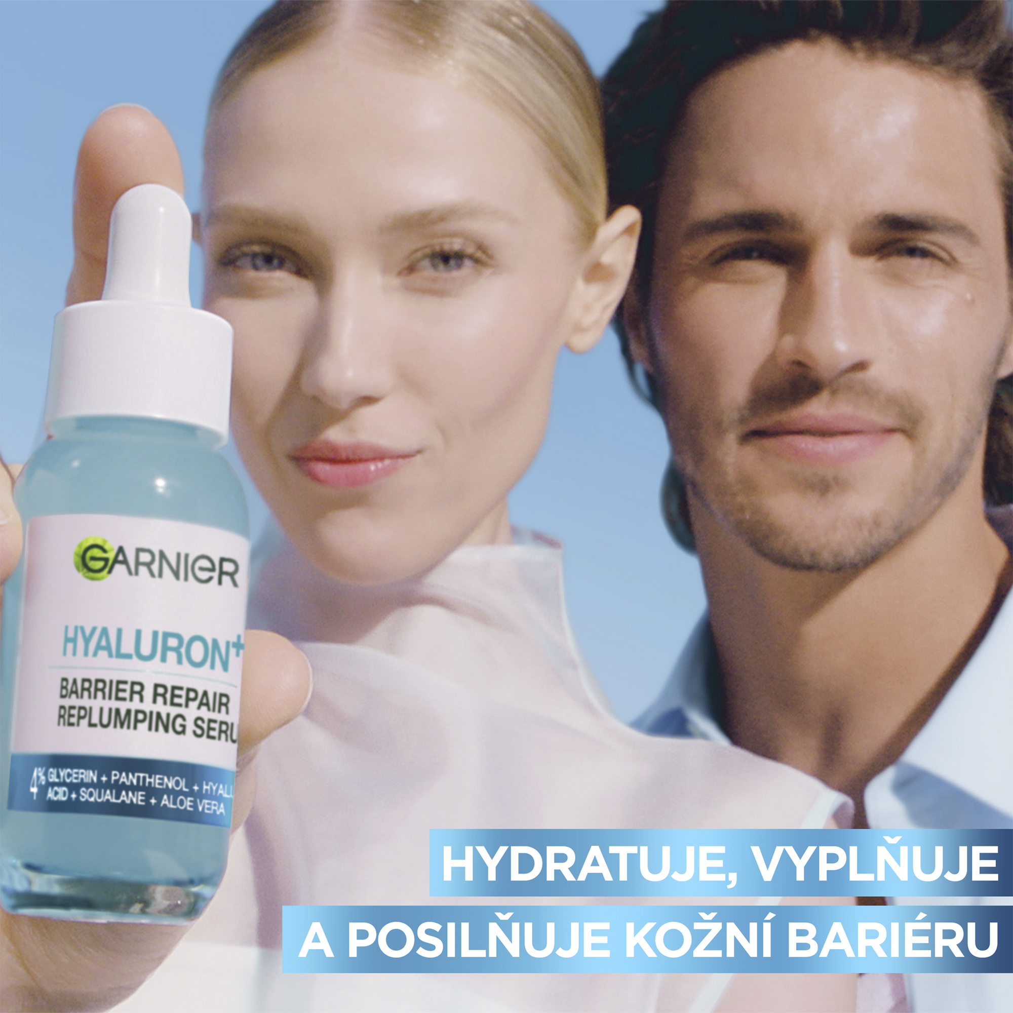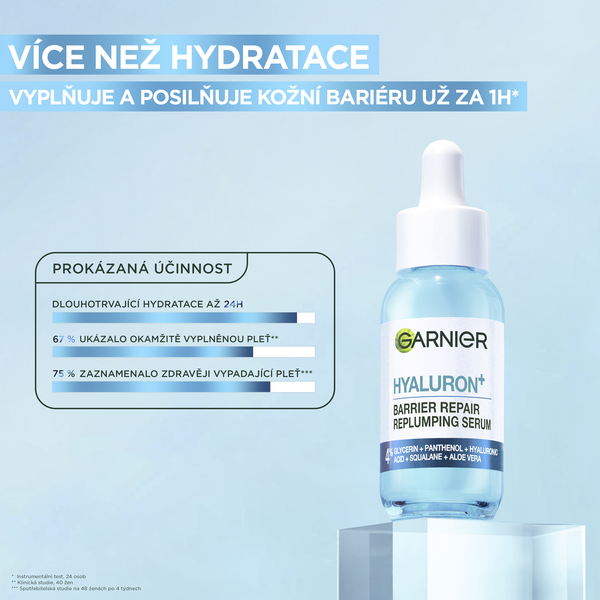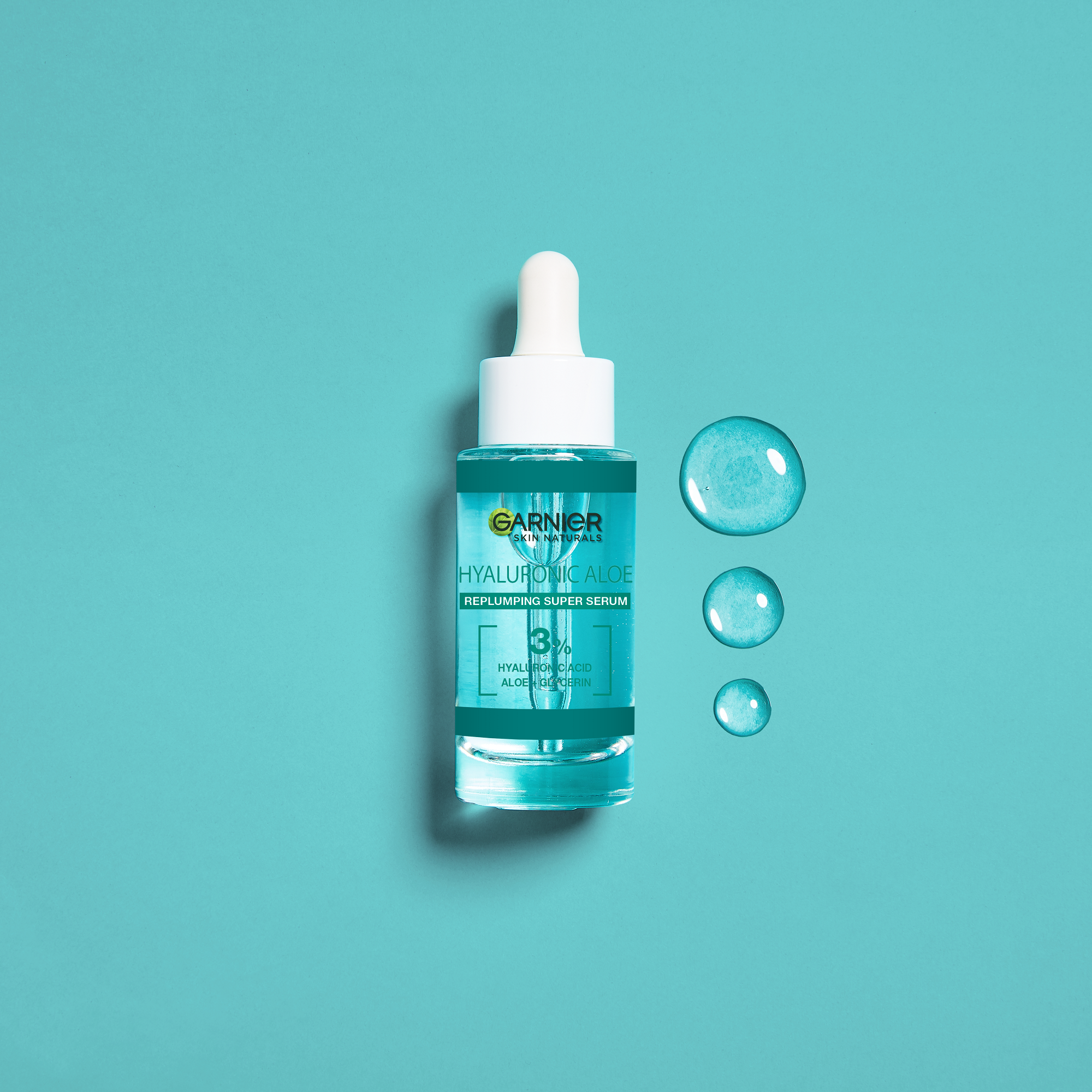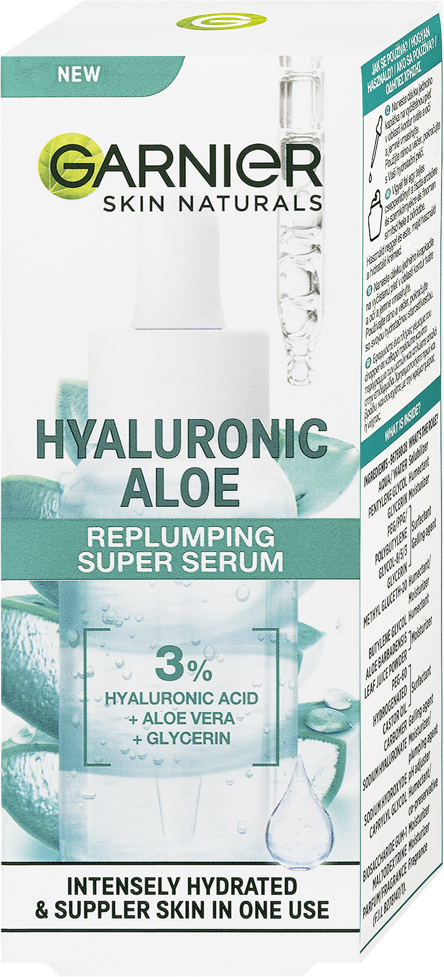 První sérum od Garnier s obsahem vysoké koncentrace [3 %] glycerinu, kyseliny hyaluronové a aloe vera pro hladší, pružnější a pevnější pleť již po prvním použití. Čistá kyselina hyaluronová je schopná vázat až 1000× více vody, než sama váží a vyplňuje pleť. Aloe vera byla vybrána pro své hydratační a osvěžující účinky.