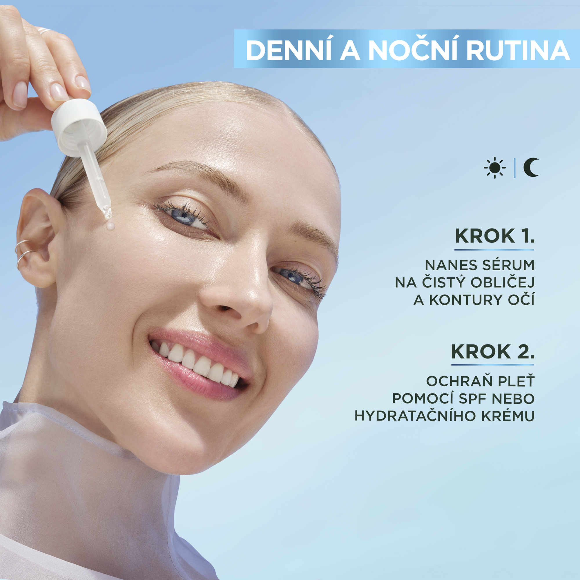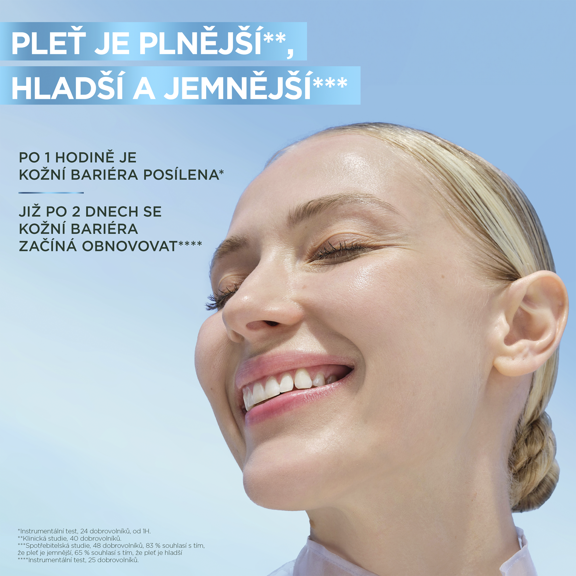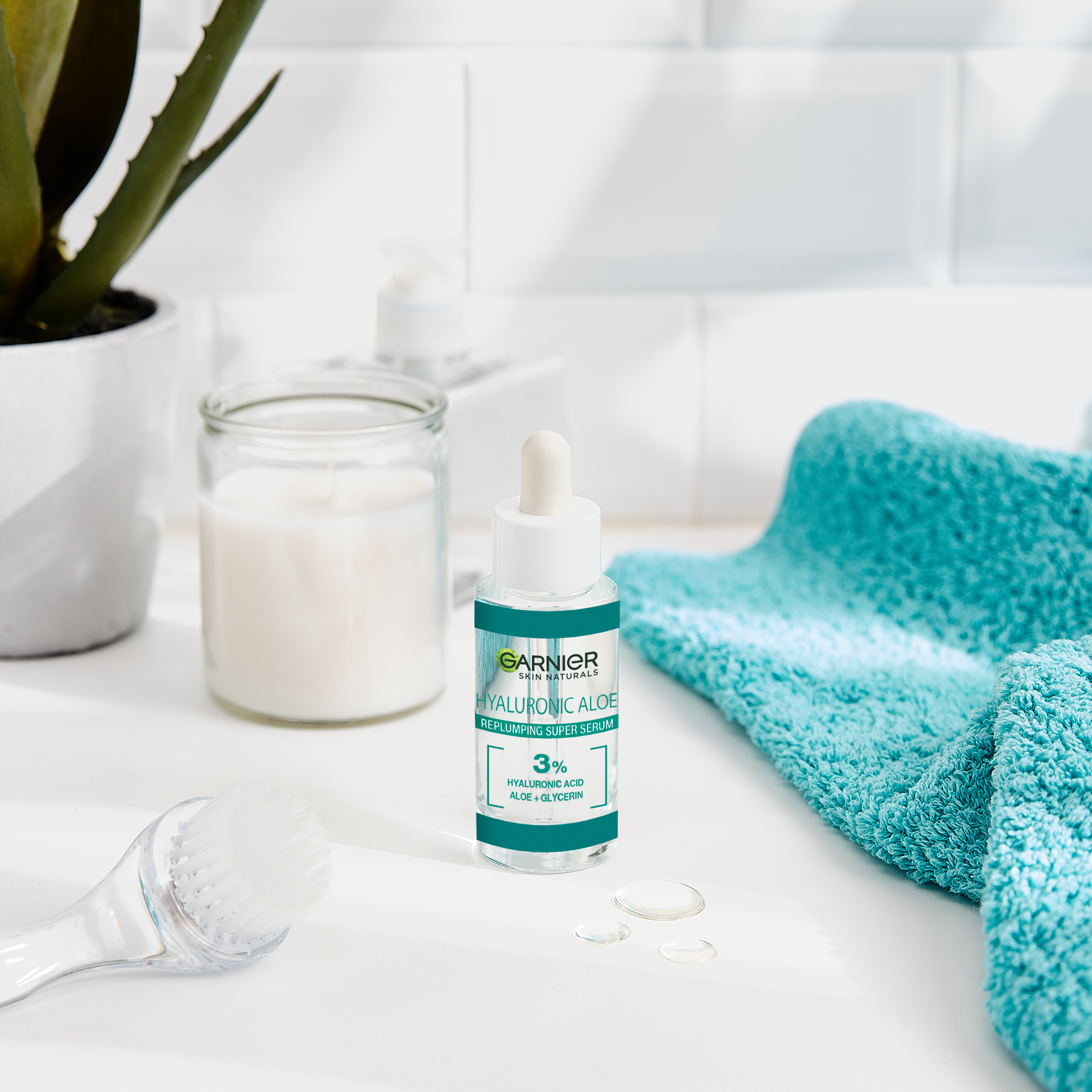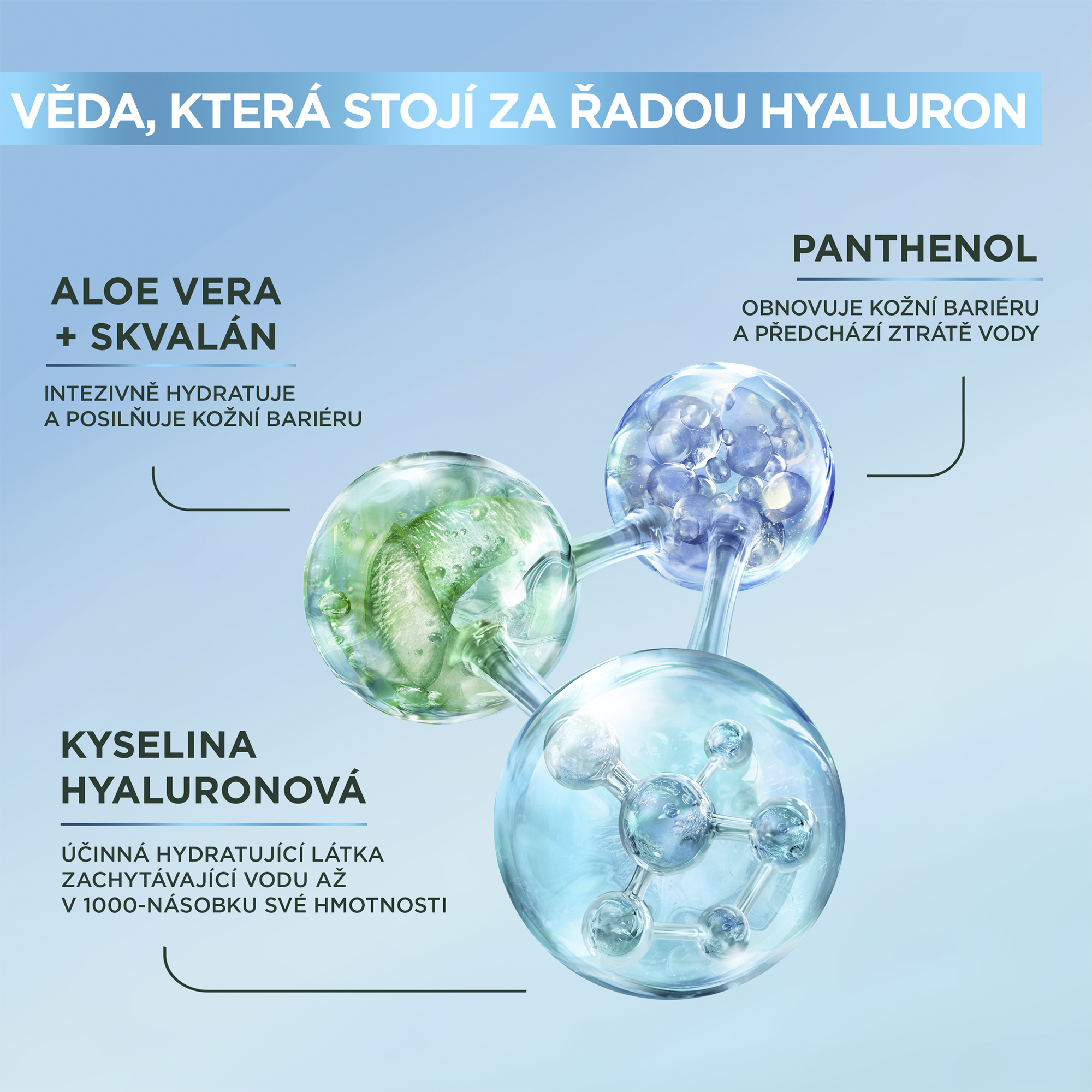 První sérum od Garnier s obsahem vysoké koncentrace [3 %] glycerinu, kyseliny hyaluronové a aloe vera pro hladší, pružnější a pevnější pleť již po prvním použití. Čistá kyselina hyaluronová je schopná vázat až 1000× více vody, než sama váží a vyplňuje pleť. Aloe vera byla vybrána pro své hydratační a osvěžující účinky.