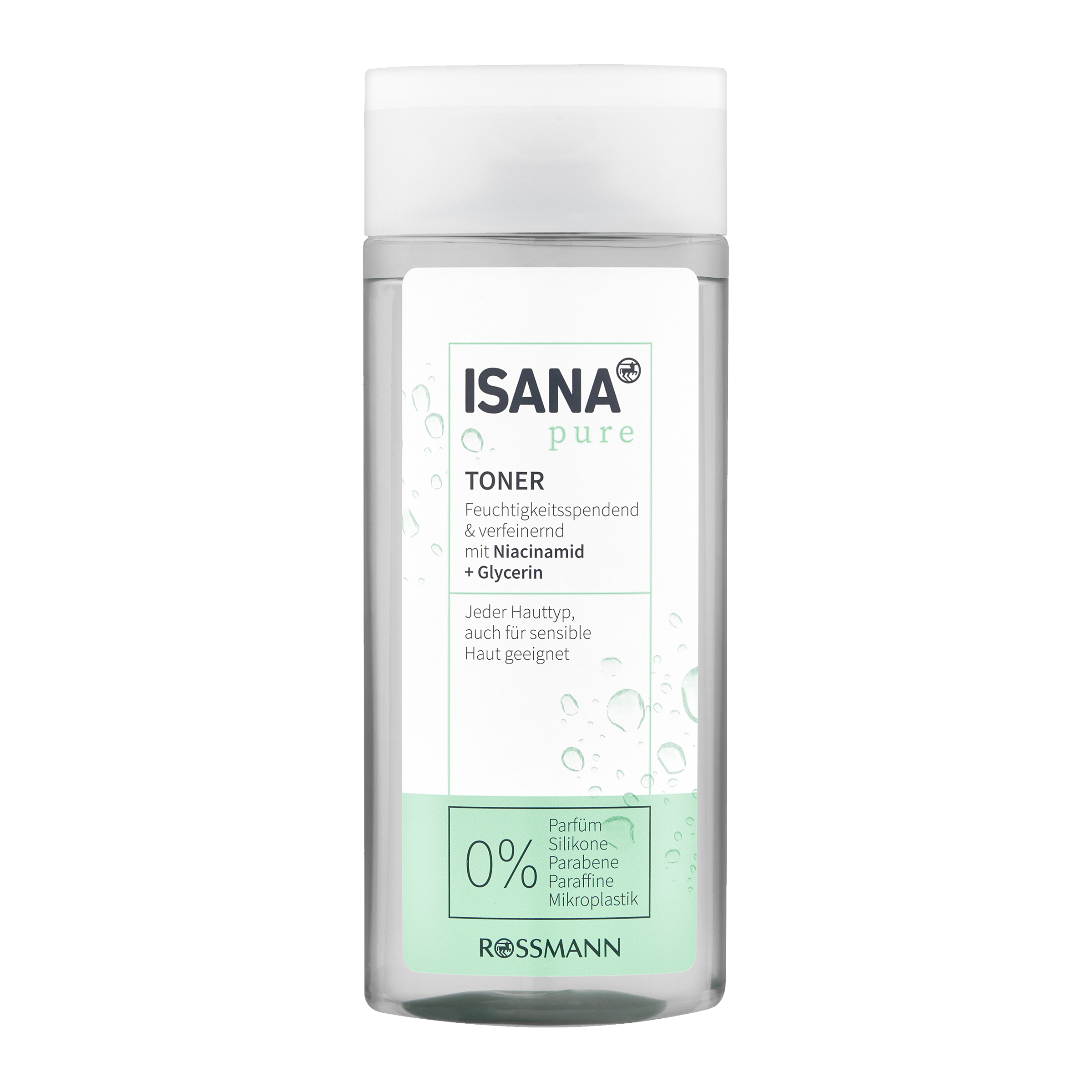 ISANA Pure Toner s niacinamidem (vitamín B3) a glycerinem pomáhá obnovit přirozený obsah vlhkosti pokožky po čištění a vyrovnává pokožku.