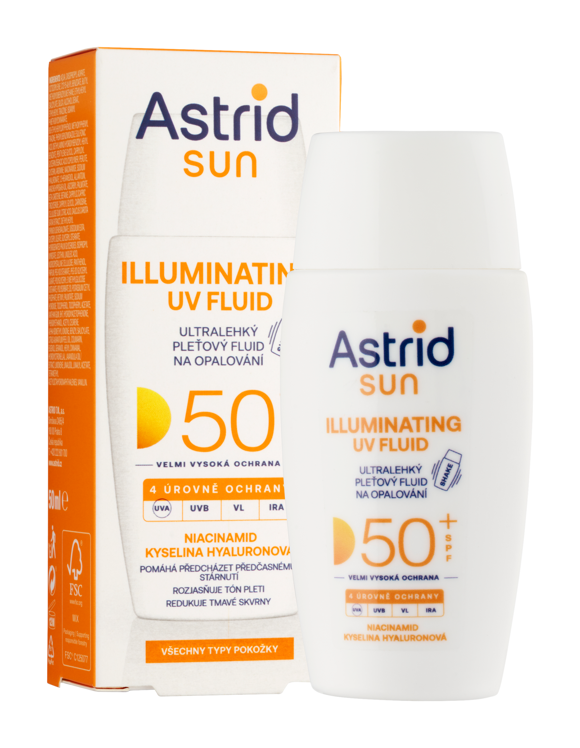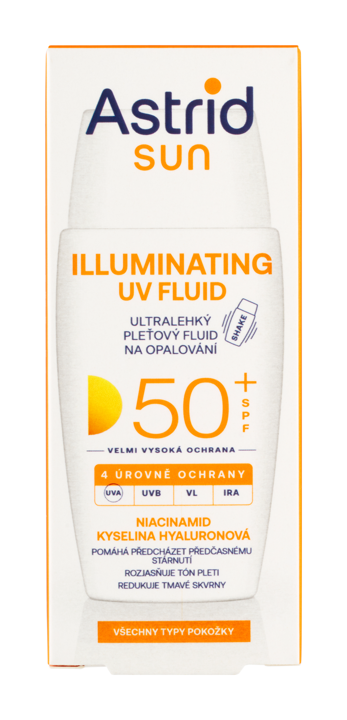 Astrid Sun Ultralehký pleťový fluid na opalování SPF 50+ je více než jen obyčejná sluneční ochrana – nabízí komplexní péči pro vaši pleť. Tento ultralehký fluid poskytuje optimální ochranu před čtyřmi hlavními typy slunečního záření – UVA, UVB, VL a IRA – které mohou poškodit pokožku. S obsahem niacinamidu se pleť rozjasňuje a získává antioxidační ochranu, čímž se chrání před předčasným stárnutím. Kyselina hyaluronová zase zajišťuje intenzivní hydrataci, čímž pomáhá pleti zůstat svěží a zdravá i po dlouhodobém vystavení slunečnímu záření.