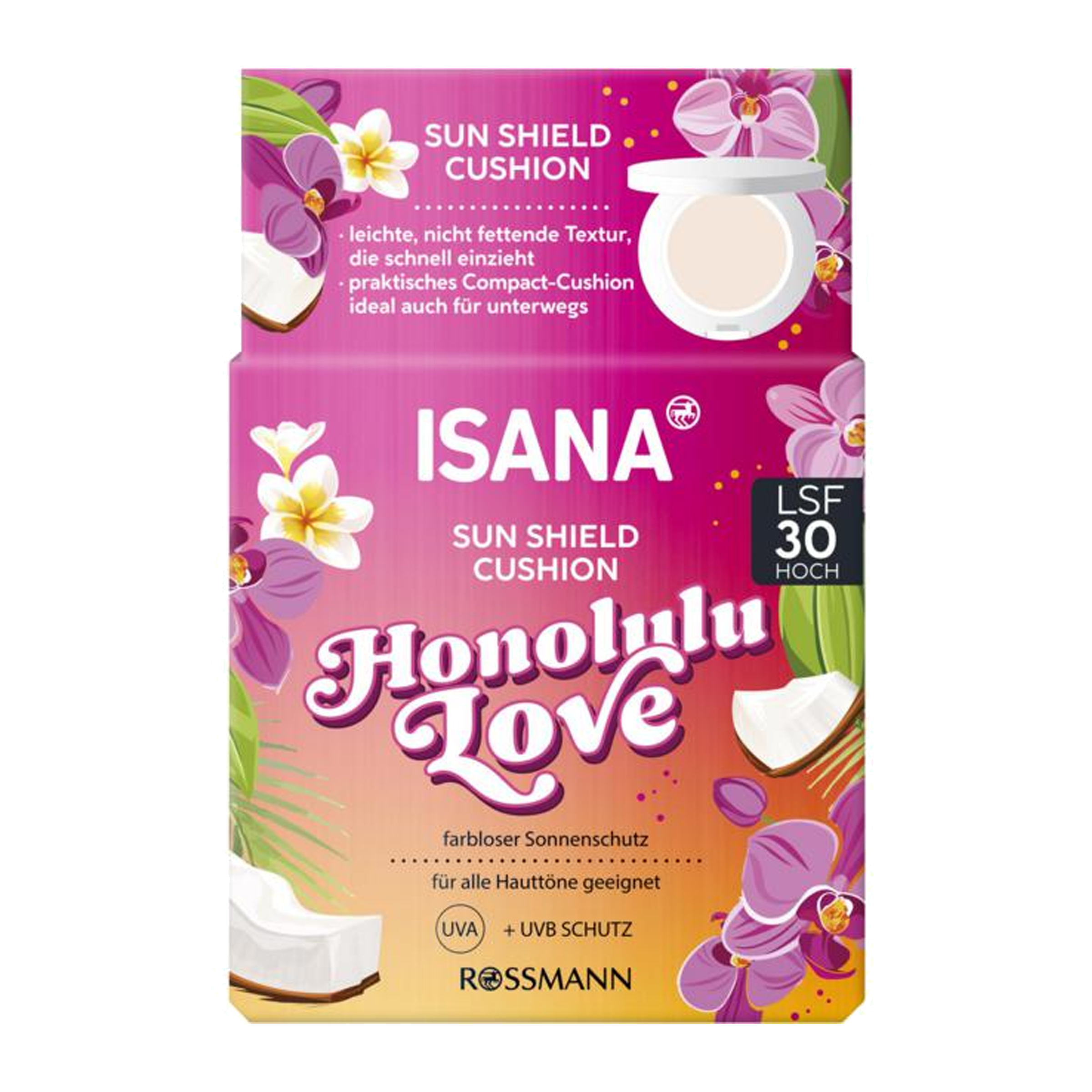 Pleťový krém Isana Sunshield Cushion Honolulu love s ochranou SPF 30 a s kombinací bambuckého másla, mandlového oleje a triglyceridů udržuje pleť hydratovanou a pružnou po celý den. Opalovací krém na pleť lze nosit samostatně pro přirozený, chráněný vzhled nebo pod make-up jako hydratační primer.