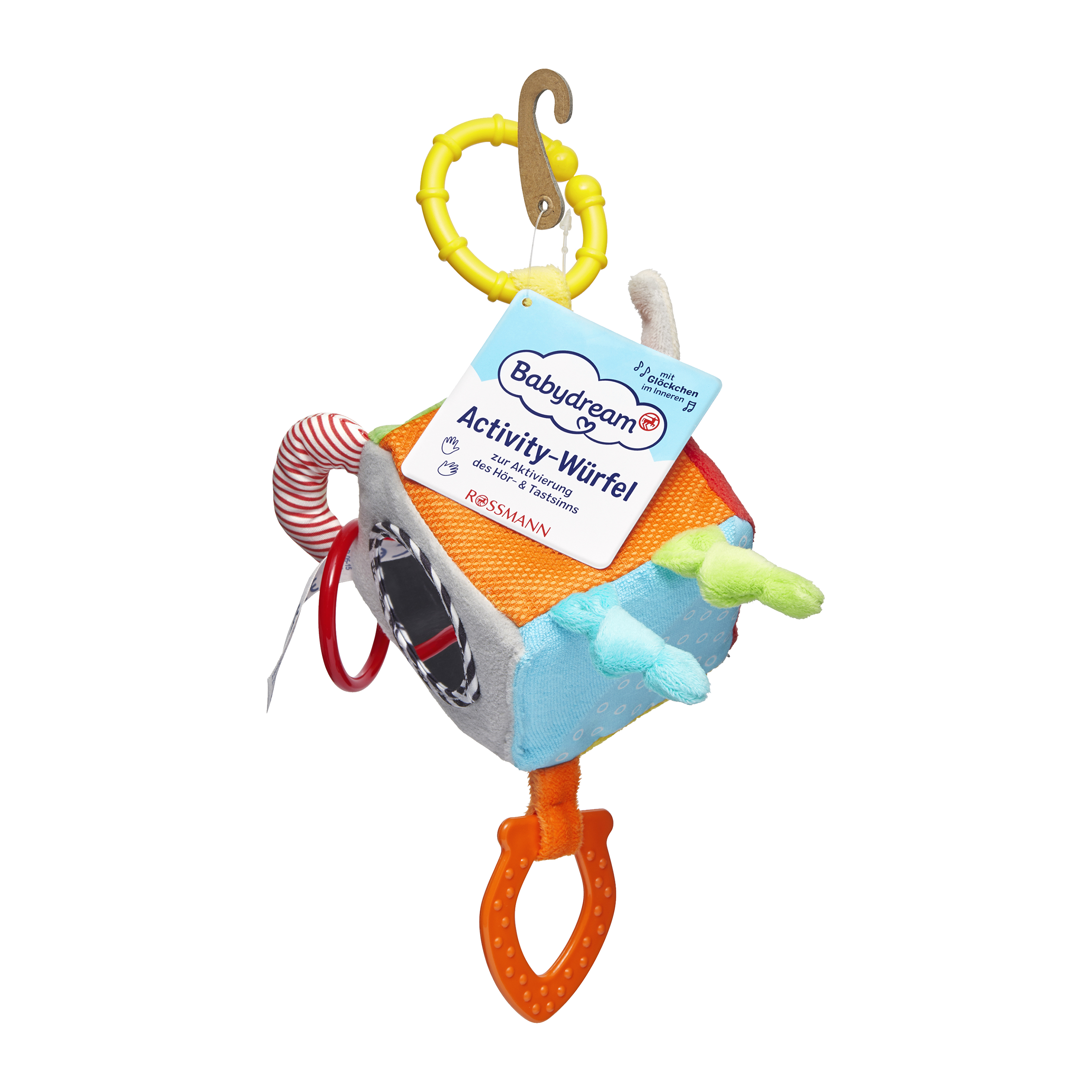 Hrací plyšová kostka Activity. S praktickým kroužkem ve tvaru C a mnoha funkcemi pro hraní. Pro děti od narození.