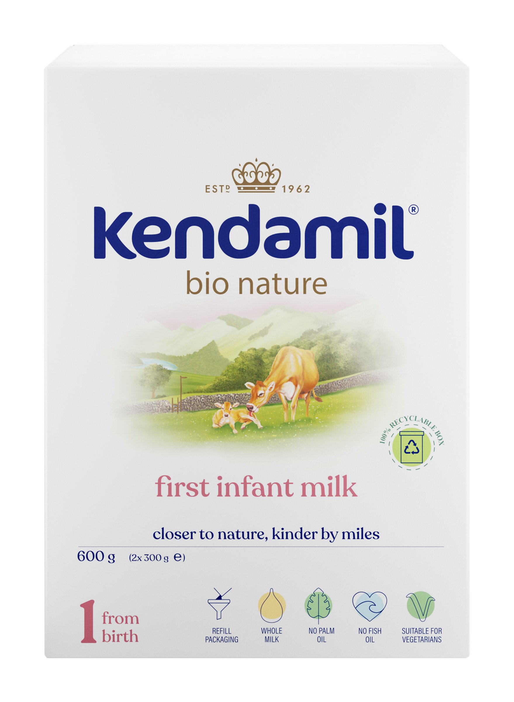 Počáteční mléčná kojenecká výživa v prášku Kendamil BIO Nature 1 pro výživu kojenců od narození, pokud nemohou být kojeni. Nová vylepšená receptura tohoto mléka vznikla na základě 60letého výzkumu a vývoje. Kojenecké mléko Kendamil BIO Nature je inspirováno tím nejlepším z čisté přírody. Jeho základ tvoří především plnotučné kravské mléko v BIO kvalitě. Určeno pro miminka od narození do ukončeného 6. měsíce, pokud nemohou být kojena. Obal je plně recyklovatelný.