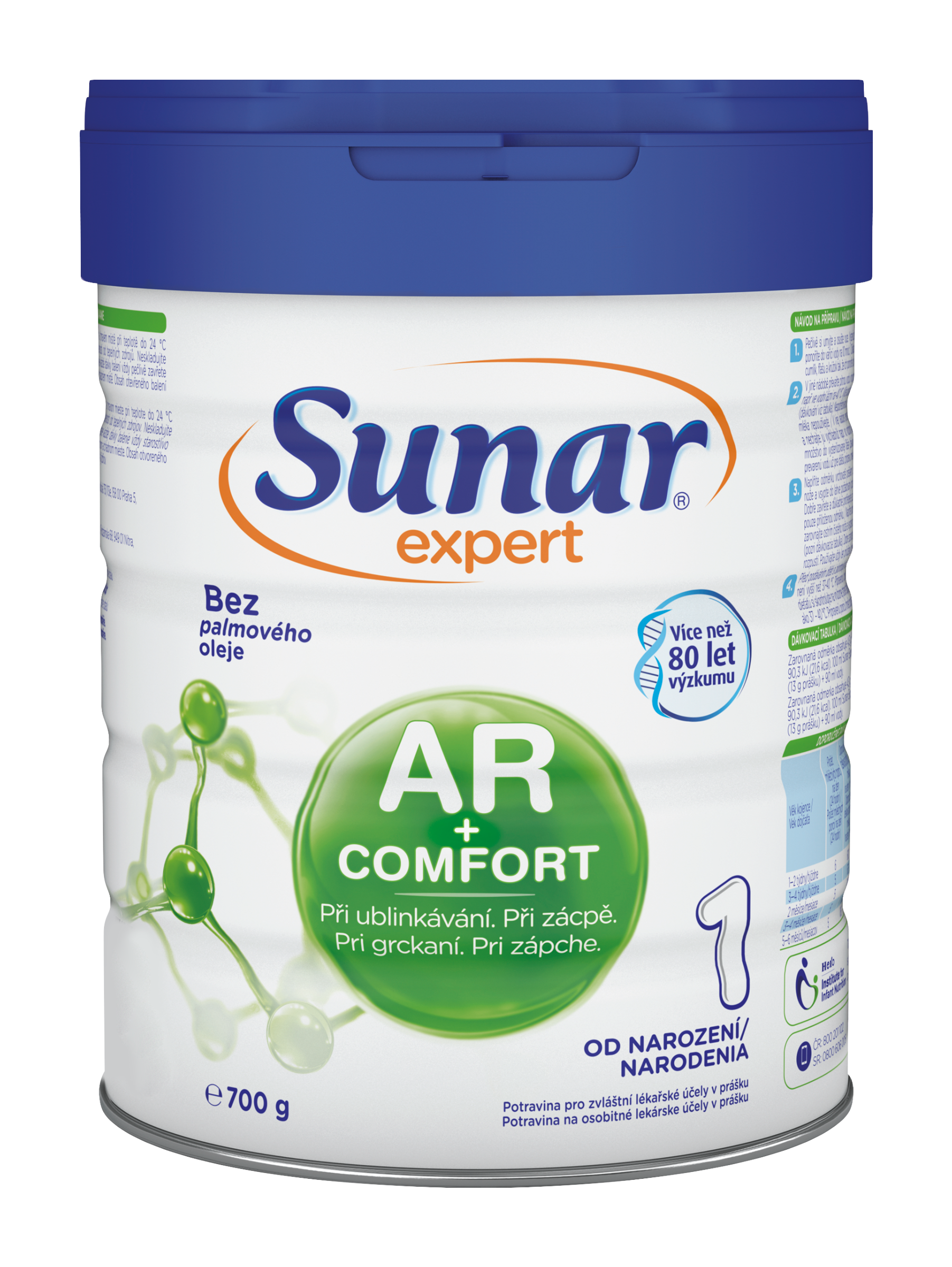 Sunar Expert AR+Comfort 1 je určen pro řízenou dietní výživu kojenců, kteří trpí buď drobným ublinkáváním nebo mají zácpu, případně se u nich vyskytují oba problémy. Sunar Expert AR+Comfort 1 navíc obsahuje mléčný tuk, díky kterému je dětmi velmi dobře přijímán. Se Sunarem nemusíte dělat žádné kompromisy a vaše děti ho budou milovat. Sunar Expert AR+Comfort 1 je určen pro řízenou dietní výživu kojenců při drobném ublinkávání a zácpě. Obsahuje speciální účinnou látku karubin, získávanou ze semen svatojánského chleba, která přispívá k zahuštění obsahu žaludku a tím i snížení výskytu ublinkávání.