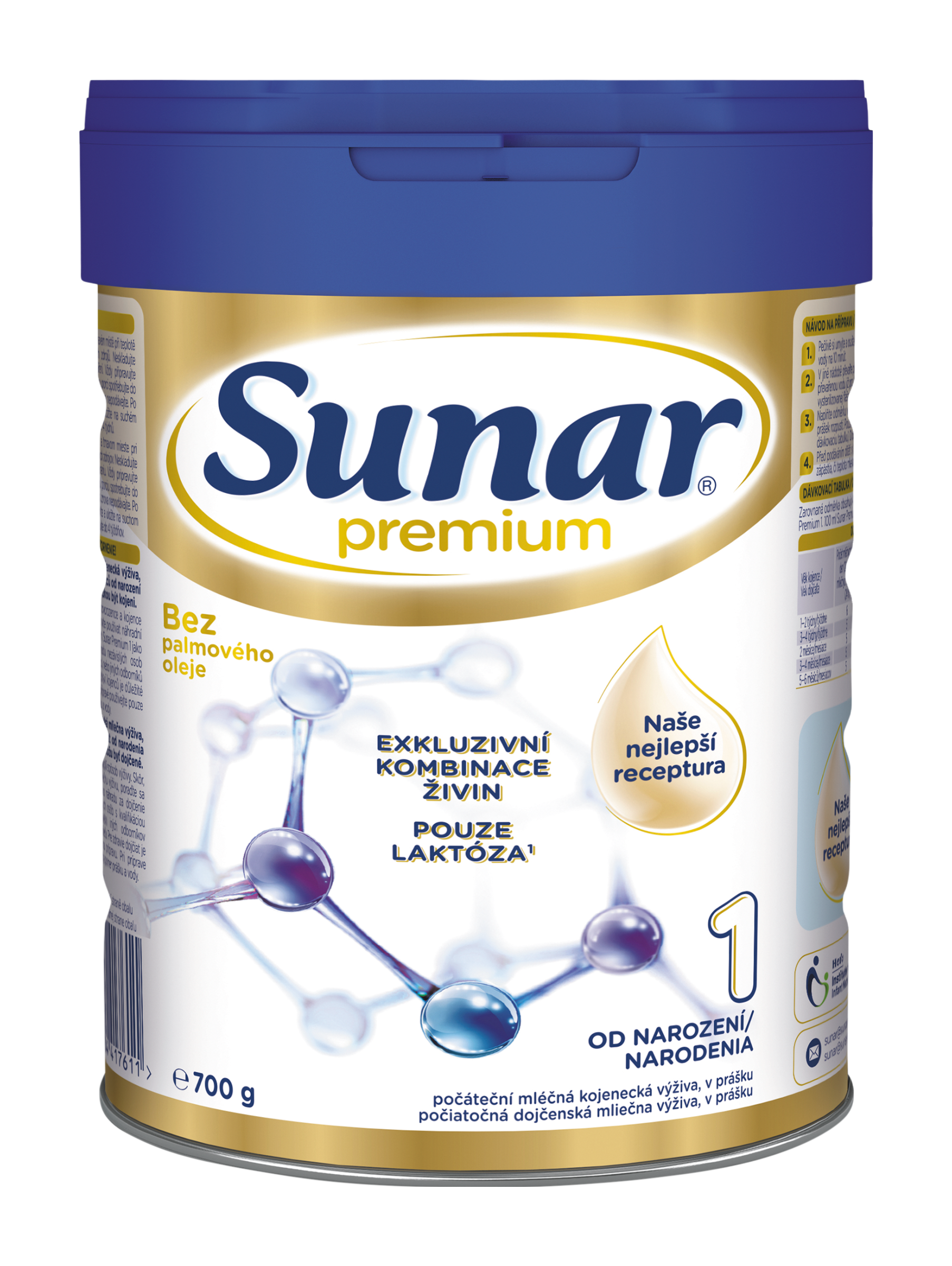 Sunar Premium 1 je počáteční mléčná kojenecká výživa, v prášku. Je určen pouze pro výživu kojenců od narození v období odstavování nebo pokud nemohou být kojeni. Potravina pro zvláštní výživu. Kojení je pro novorozence a kojence nejlepší způsob výživy. Dříve, než se rozhodnete používat náhradní mléčnou výživu, poraďte se s dětským lékařem. Sunar Premium 1 jako náhradu za kojení používejte pouze na radu nezávislých osob kvalifikovaných v lékařství, výživě nebo farmacii, nebo jiných odborníků odpovědných za péči o matku a dítě. Pro zdraví kojenců je důležité správné dodržování návodu k přípravě. Při přípravě používejte pouze přiloženou odměrku. Neměňte poměr prášku a vody. Upozornění: Doporučené denní dávky mléka jsou orientační, řiďte se individuální potřebou dítěte a doporučením pediatra. Při krmení neponechávejte dítě bez dozoru, hrozí riziko zalknutí. Pro zdraví kojenců a malých dětí je důležité správné dodržování návodu na přípravu, používejte pouze přiloženou odměrku, neměňte poměr prášku a vody. Při nesprávném skladování a nedodržení správného návodu na přípravu může dojít k ohrožení zdraví dítěte. Po konzumaci mléka, zejména před spaním, dbejte na správnou a pravidelnou hygienu ústní dutiny a prvních zoubků.