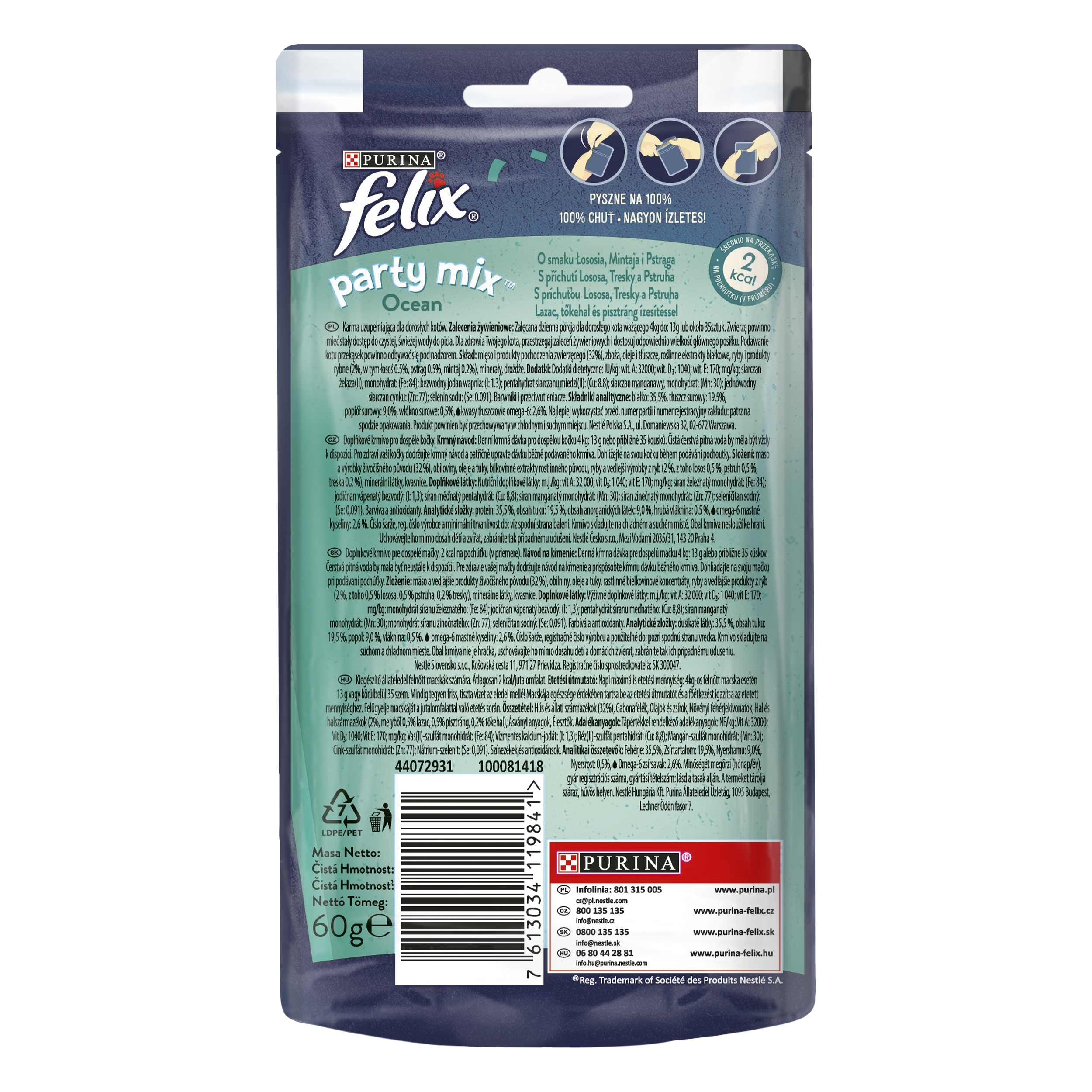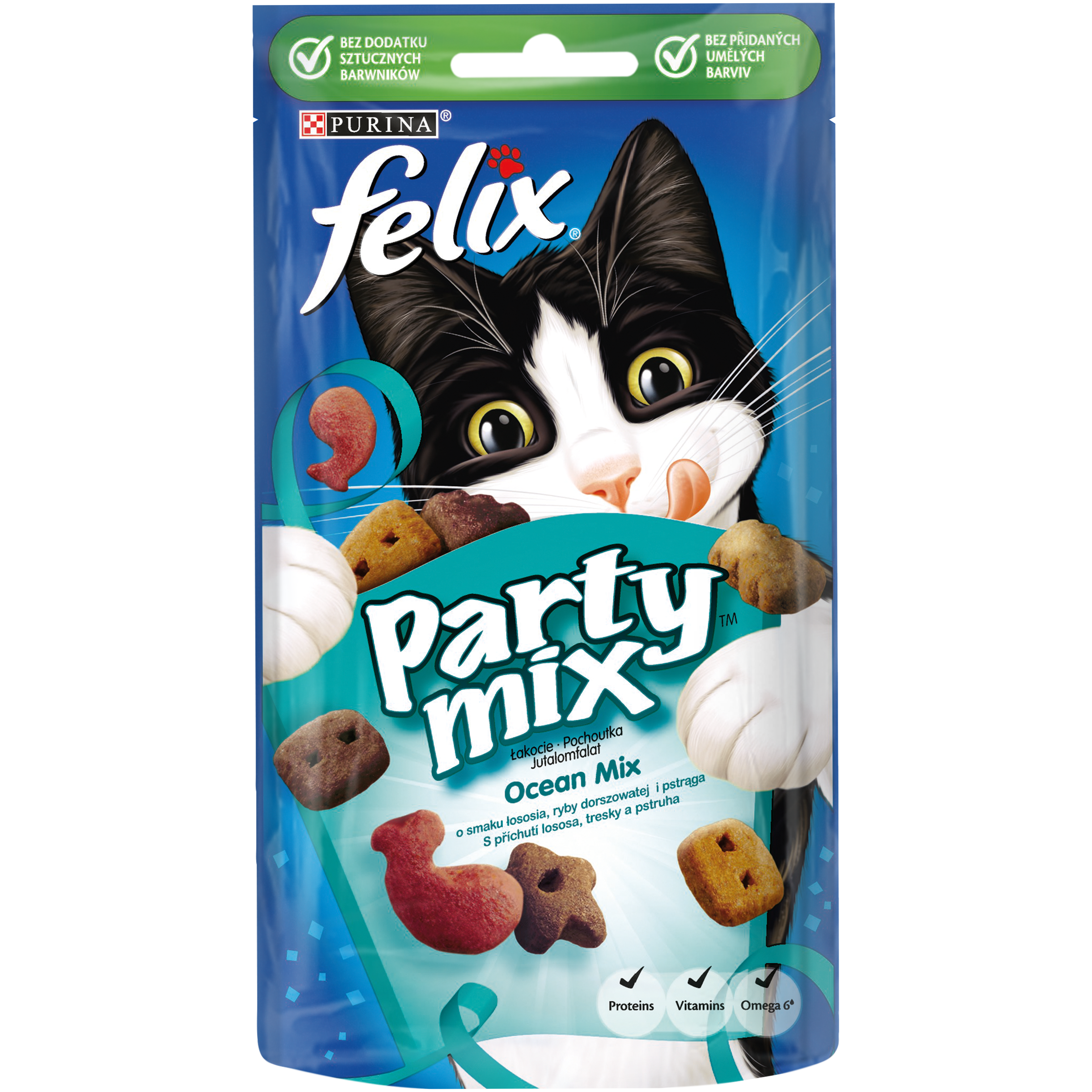 FELIX Party Mix Ocean s příchutí lososa, pstruha a tresky. Obsahuje neodolatelný mix pochoutek, který je plný lákavých vůní, lahodných příchutí a atraktivních tvarů. FELIX Party Mix pochoutky jsou plné lákavých vůní, lahodných příchutí a atraktivních tvarů.