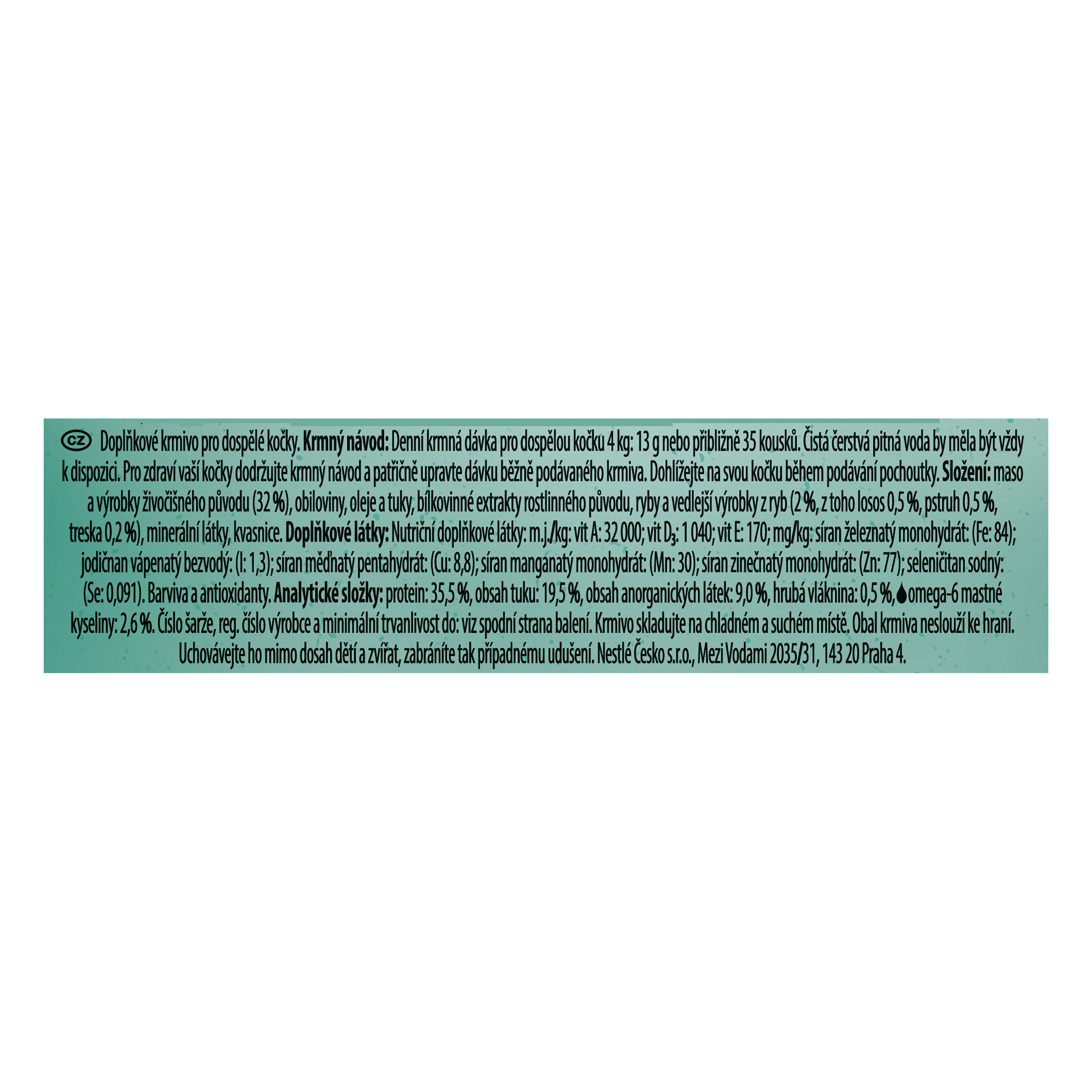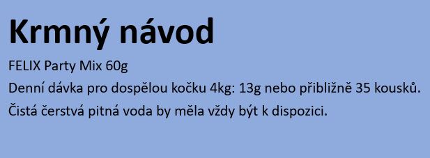 Krmný návod: Denní krmná dávka pro dospělou kočku 4 kg: 13 g nebo cca 35 kousků. Čistá čerstvá pitná voda by měla být vždy k dispozici. Pro zdraví vaší kočky dodržujte krmný návod a patřičně upravte dávku běžně podávaného krmiva. Dohlížejte na svou kočku během podávání pochoutky.
