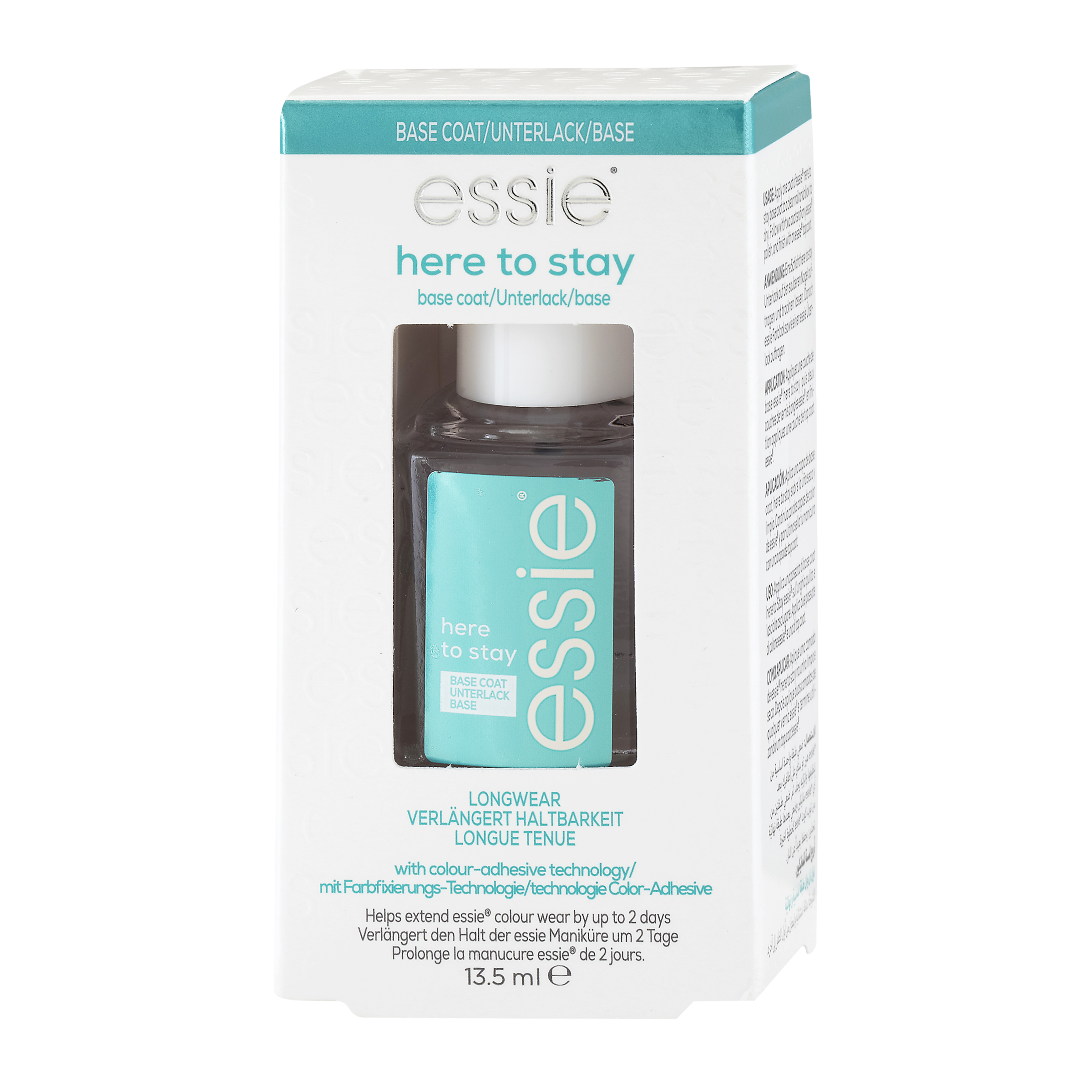 Prodlužte si výdrž barvy díky expertovi na salónní manikúru. Podkladový lak Essie Here to Stay má inovativní složení a umožňuje barevnému laku Essie lépe přilnout k nehtu. Zároveň zabraňuje nežádoucímu zbarvení samotného nehtu. A výsledek? Krásná barva, která vydrží.