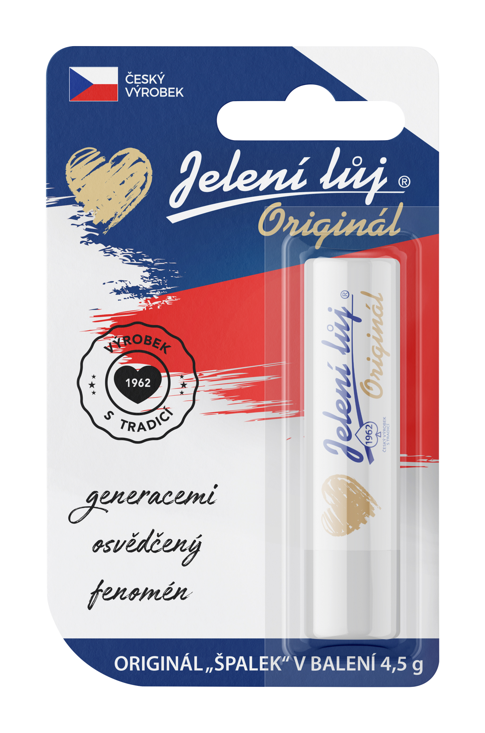Jelení Lůj® Originál je tradiční český výrobek kosmetiky Regina®. Je vyrobený dle jedinečné receptury převážně z přírodních surovin. Jelení lůj rty chrání před vysoušením a popraskáním. Regeneruje pokožku rtů, tvoří ji odolnou vůči mrazu, extrémnímu horku i dalším nepříznivým povětrnostním vlivům. Originál „špalek“ v balení Originál „špalek“ tak jak ho znáte v praktickém balení do kapsy. Výrobek s tradicí 1962.