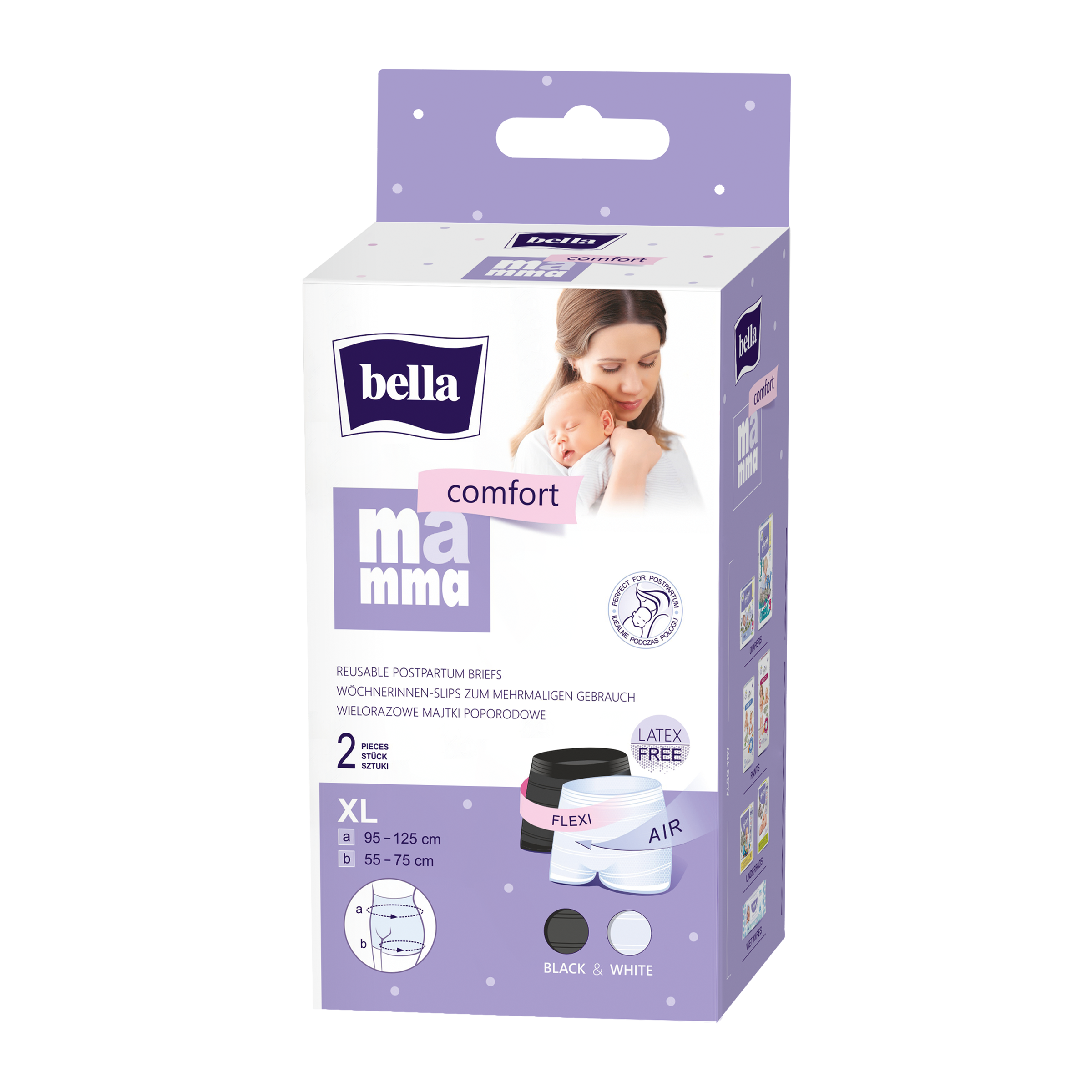 Pratelné, prodyšné, esteticky provedené poporodní kalhotky dokonale přiléhající k tělu. Udržují poporodní vložku na místě. Neomezují proudění vzduchu, což je důležité pro rychlé hojení poporodních ran. Prodyšné elastické poporodní kalhotky bella mamma comfort jsou ideální pro použití v kombinaci s poporodními vložkami bella mamma comfort. Hustě tkaný materiál bez latexu poskytuje dokonalý komfort při nošení.