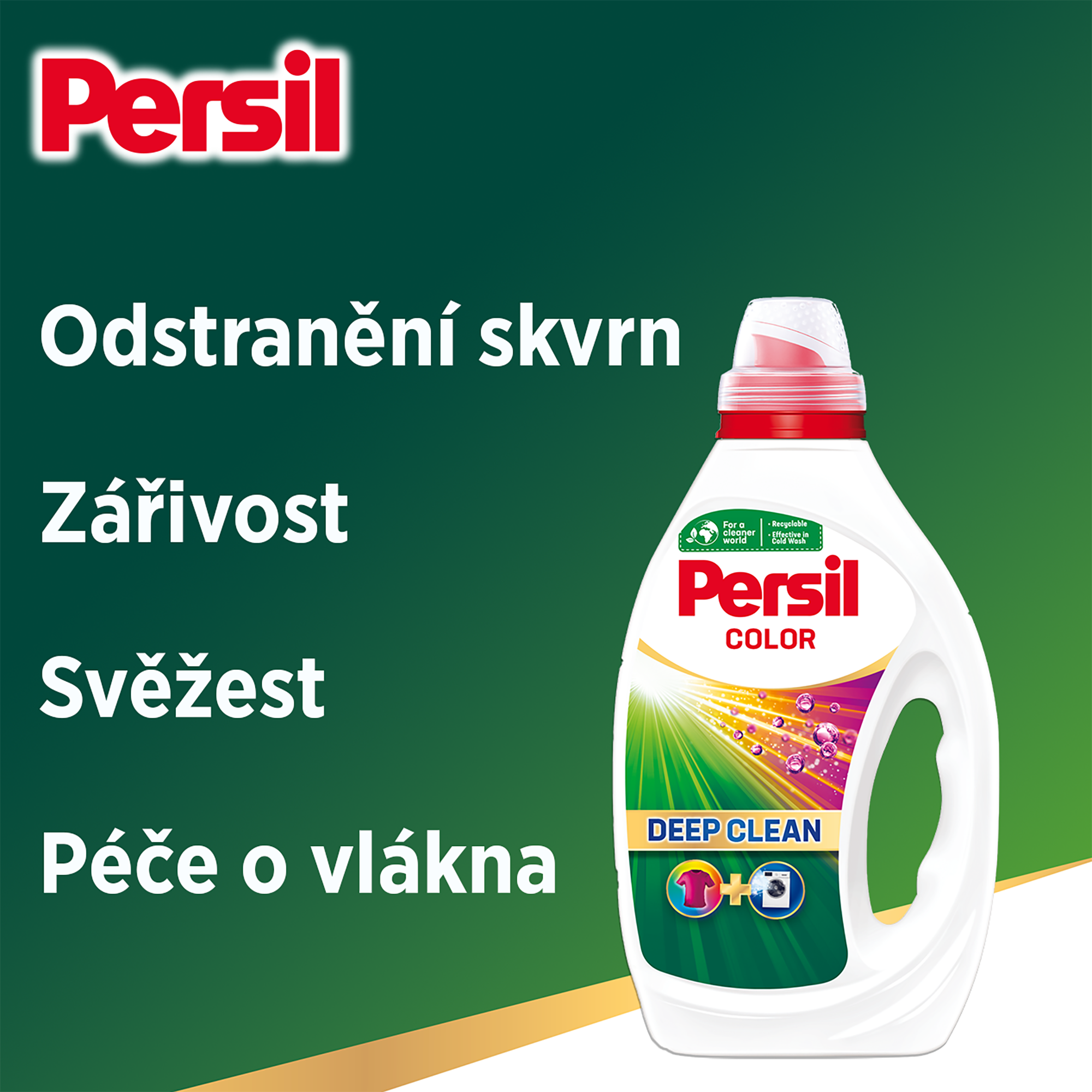 Zažijte hloubkově čisté prádlo a hygienicky svěží pračku I po vyprání může z pračky vycházet nepříjemný zápach, protože po praní znečištěného prádla se v pračce mohou usazovat nečistoty. Pro dosažení opravdové čistoty, kterou pro své oblečení potřebujete, se můžete vždy spolehnout na Persil Deep Clean. Jedinečné složení pracího prostředku proniká hluboko do vláken, kde rozloží i ty nejodolnější skvrny a odstraní je. Složení je navrženo tak, aby vašemu oblečení dodalo pocit svěžesti a čistoty, poté působí hluboko uvnitř mechanismu pračky a odstraňuje nečistoty. které mohou způsobovat nepříjemný zápach.