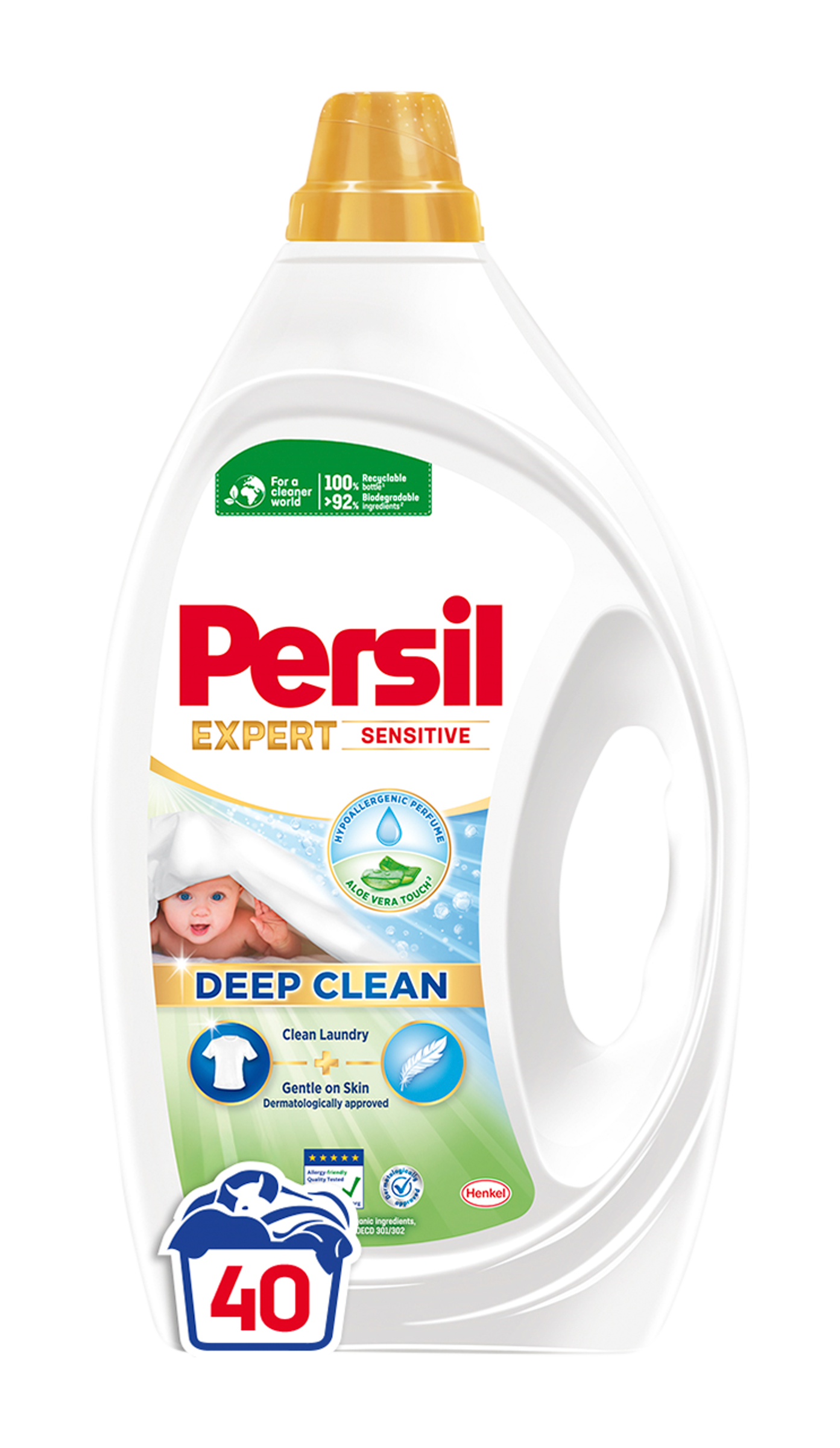 Persil prací gel Sensitive - Zažijte dokonale čisté prádlo a šetrnou péči o vaši pokožku. Persil gel Sensitive byl vyvinut speciálně pro citlivou pokožku. Jemný prací prostředek zajistí nyní víc než jen efektivní odstranění skvrn. Neobsahuje žádná barviva, aby se minimalizovalo riziko podráždění, což z něj činí ideální prací prostředek na dětské nebo kojenecké oblečení. Prací prostředek zajišťuje čistotu pro bílé nebo barevné prádlo a zároveň dodává vašemu oblečení jemnou vůni. Naše složení bylo certifikováno institutem ECARF, aby usnadnilo každodenní život našich spotřebitelů s alergiemi a citlivou pokožkou. Pro čistější svět: Persil prací prostředek je navržen pro odstranění odolných skvrn a nyní je vyráběn ve 100% recyklovatelném obalu a navíc obsahuje 92 %* biologicky rozložitelných složek. Účinné při nízkých teplotách - praní ve studené vodě již od 20 °C, aby se šetřila energie při každém praní. Nyní i v budoucnu se Persil zavázal poskytovat skutečně hloubkové čištění prádla a přitom být šetrný k planetě. Šetřete energii díky silnému složení Persil Deep Clean, které přináší efektivní výsledky i při plné pračce a při nízkých teplotách.